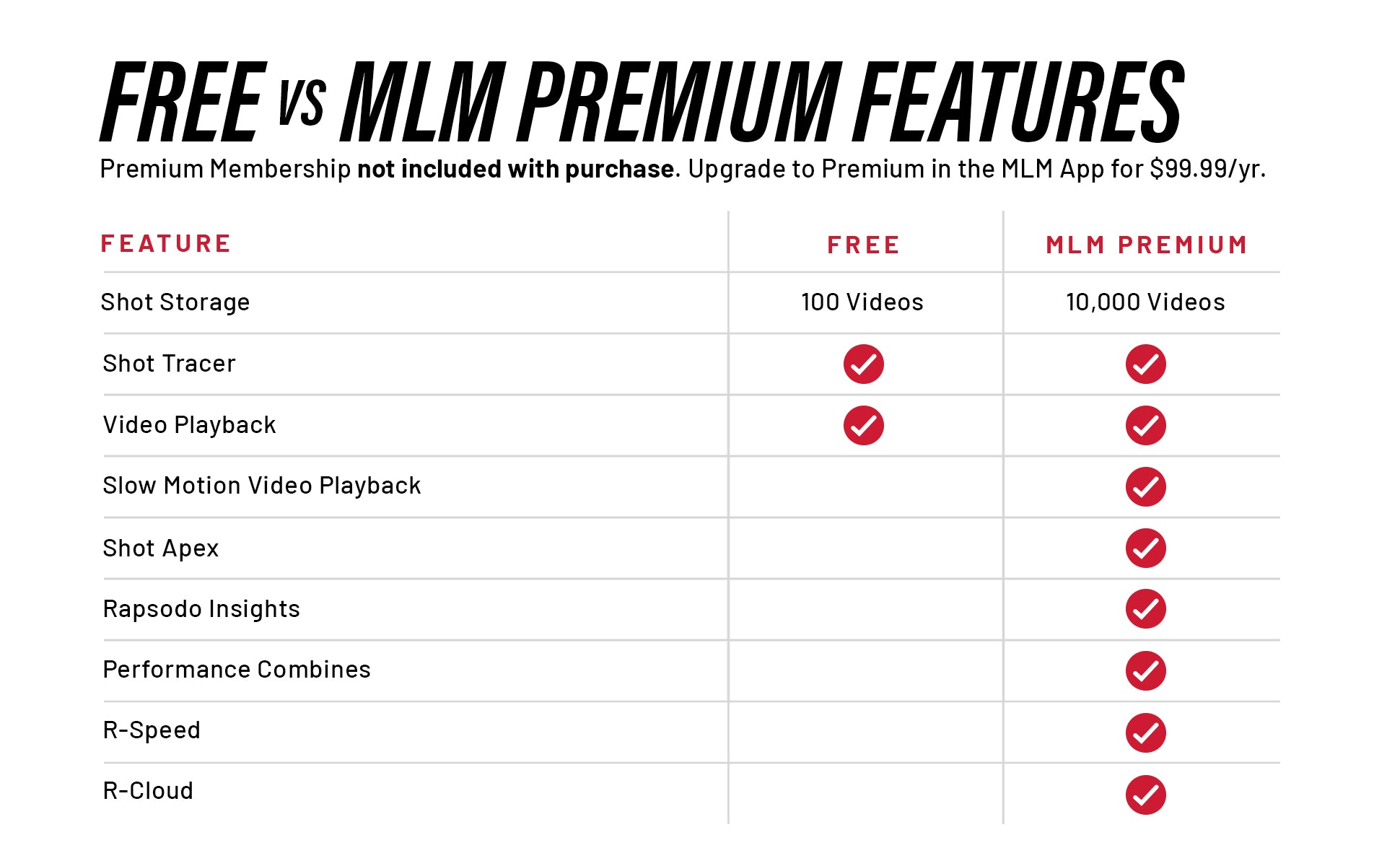 The MLM provides pro-level accuracy on: Carry Distance, Total Distance, Launch Angle, Launch Direction, Side Carry, Smash Factor, Club Speed and Ball Speed. Get the most out of your game with a MLM Premium Membership and get access to Personalized Insights and Key Takeaways like shot dispersion, club gapping, shot shape frequency and more. Plus Premium features like slow motion video replays, shot apex, Performance Combines and access to online golf lessons.