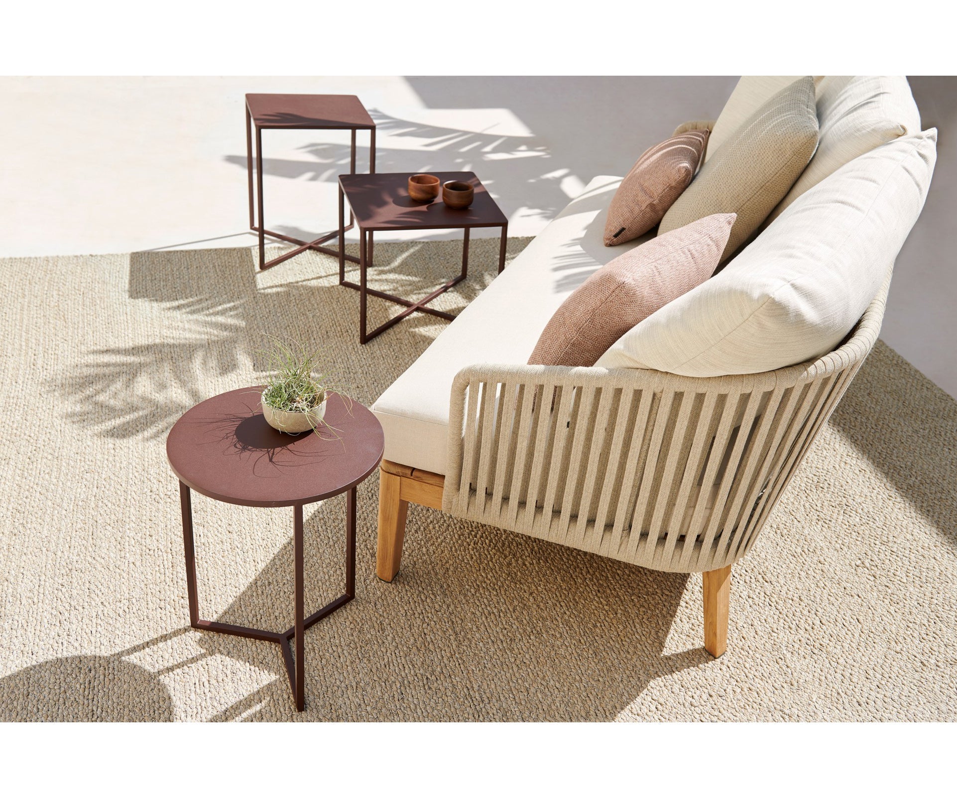 The airy design of the Mood collection and its warm combination of teak and handwoven backs will immediately create an intimate atmosphere on your patio. The rounded design of the durable teak gives the sofa a warm and friendly tone. The weave in Tricord has a very soft touch, but can nevertheless defy all weather conditions. Tribù has developed a range of natural colours that fit in with any type of outdoor environment. The comfortable outdoor cushions can be left out in the rain, thanks to the ventilating, water-repellent filling. The back cushions are available in various styles to match every taste.