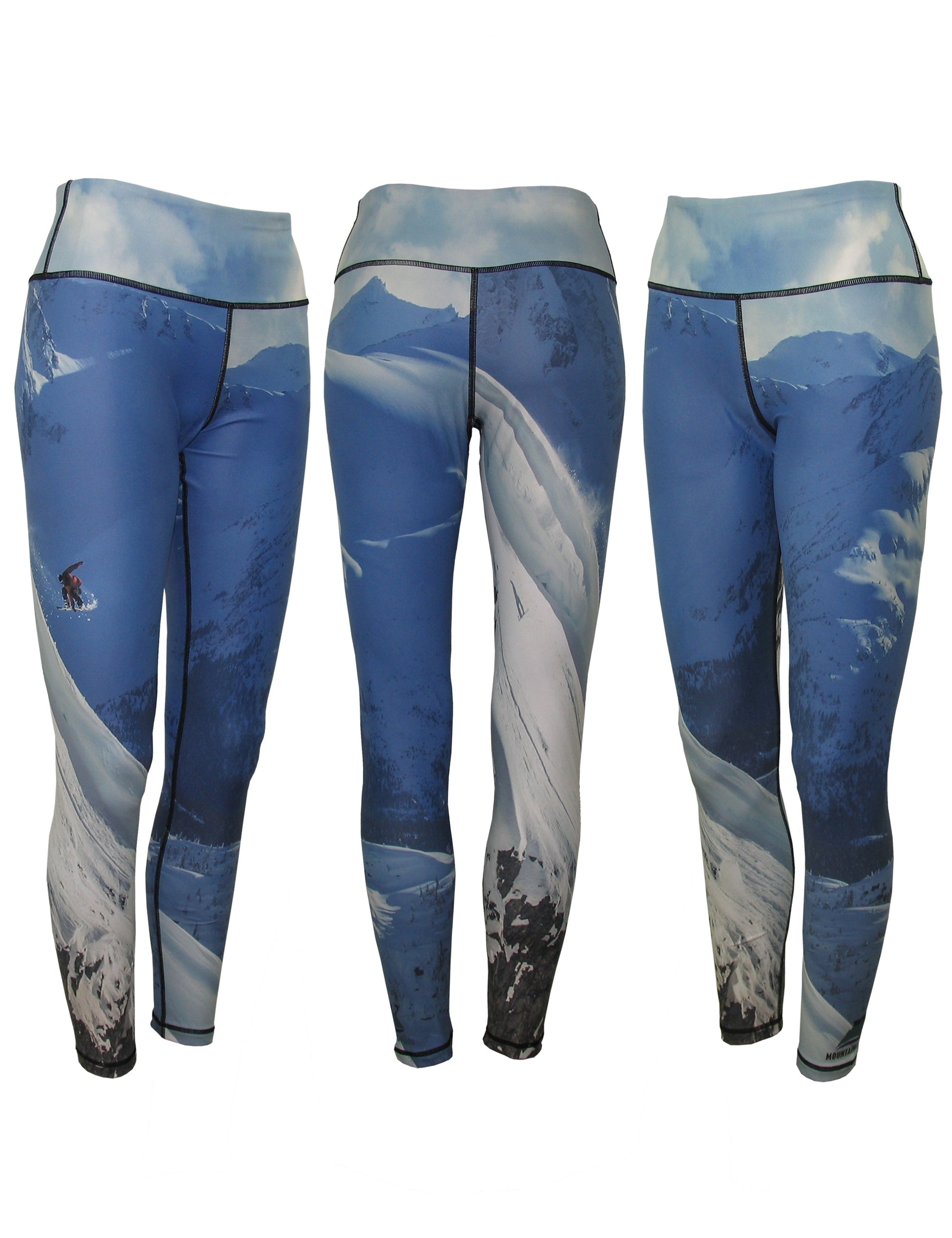 These yoga-style leggings feature an epic view of an extreme snowboarder experiencing flight in the Rockies. We make the best women's outdoor skiing, snowboarding, hiking, and climbing clothing available. Wear as wader liners, long underwear, workout leggings, or for a night on the town. Our outdoor apparel works well as hiking clothes on the trail or as a base layer for active sports. Moisture wicking apparel with great sun protection.
