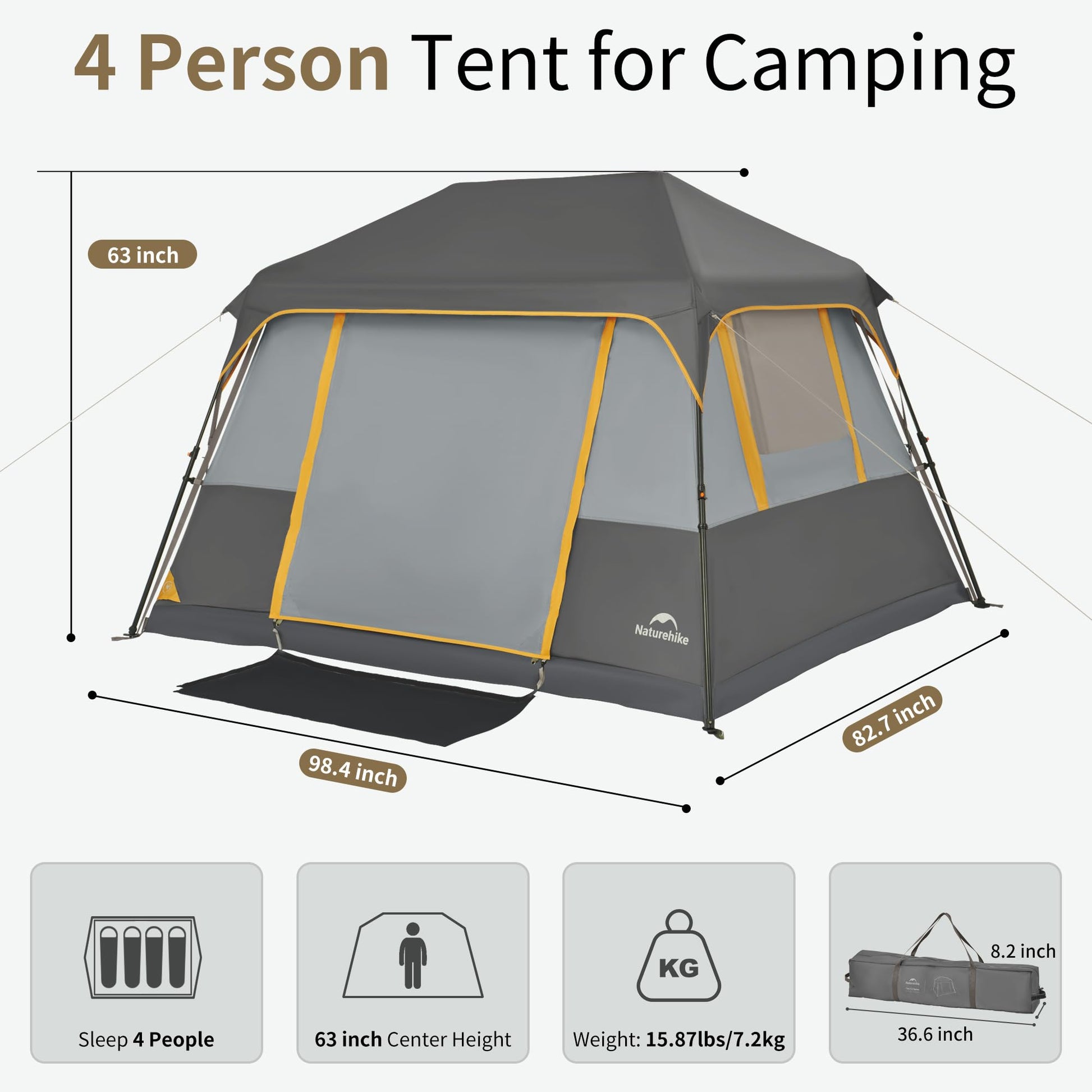Naturehike CAPE Series 5.2 Fast Automatic Cabin Tent for up to 4 Person Outdoor Camping Quick Build Pop up Instant Tent Large 5.2m² Interior Space