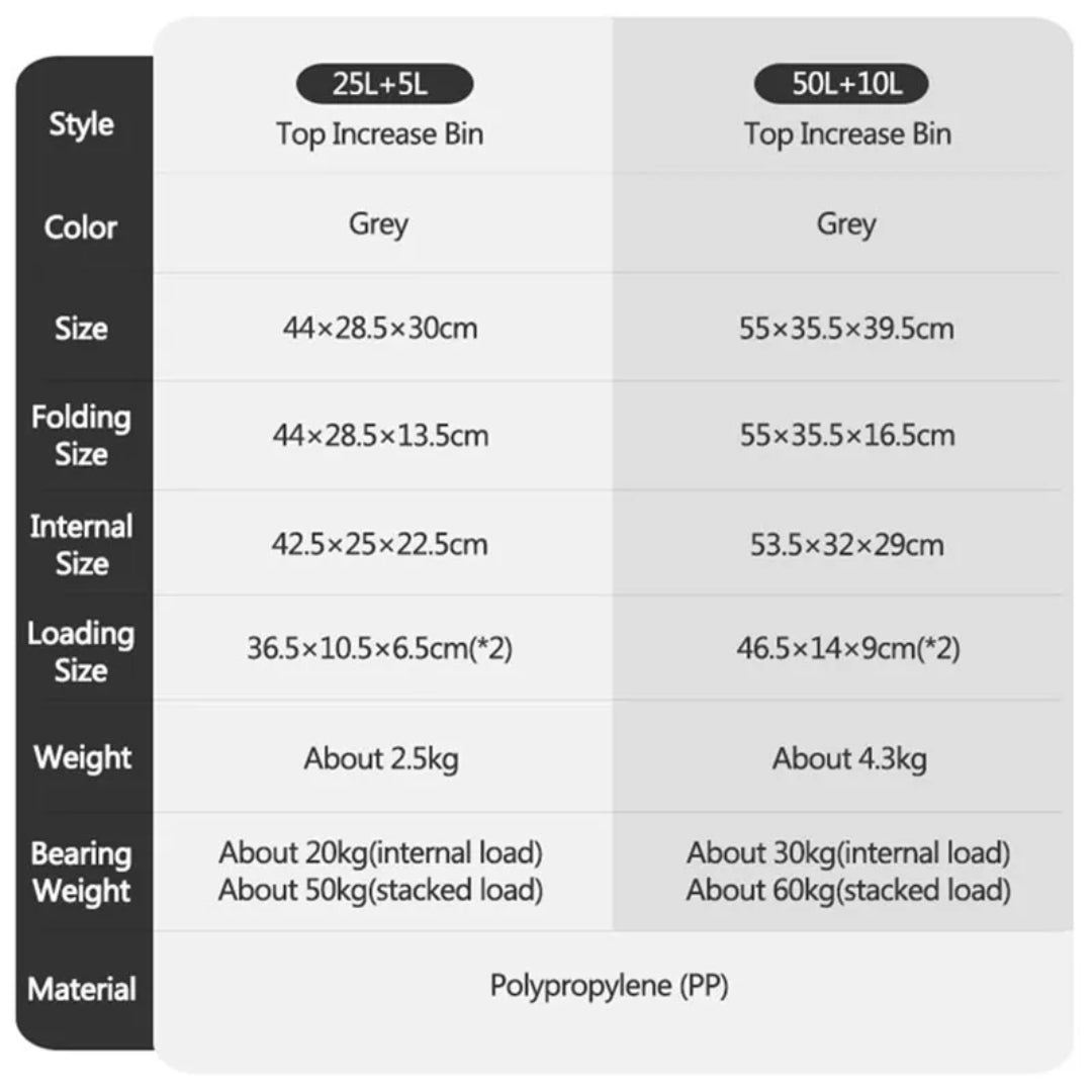 Internal Size: 42.5x25x22.5cm (25L+5L) / 53.5x32x29cm (50L+10L)