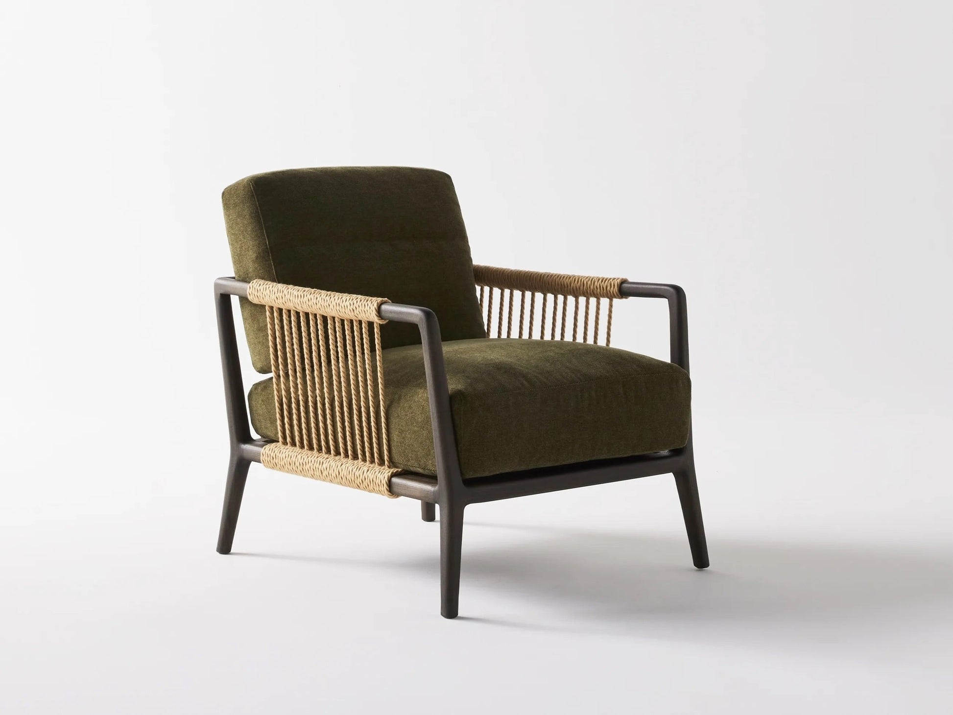 The SUNDAY Armchair seamlessly blends craftsmanship and comfort, with natural rope-woven armrests that bring warmth and character to any space. The SUNDAY armchair is crafted for ultimate relaxation, offering balanced proportions that harmonize elegance and ease. The generously padded seat and back cushions provide exceptional support, while the refined solid wood frame, available in walnut-stained or black-stained ash, effortlessly complements leather, suede, or fabric upholstery from the collection.