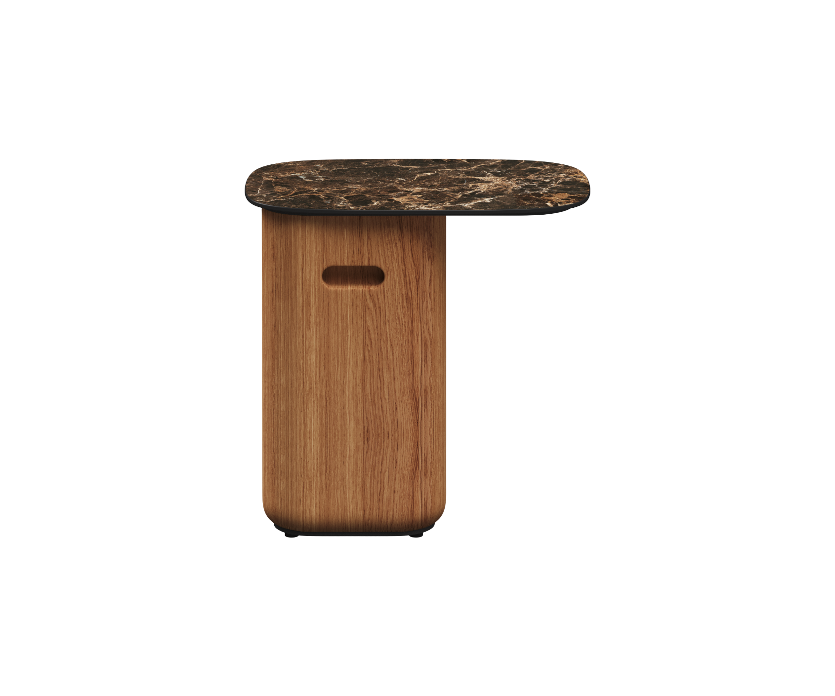 Notes: Natural finish teak base. One piece ceramic table top. Handles on base to be used for lifting the table. Table comes with empty bag that can be filled with sand and inserted into the base cavity if additional stability is required.