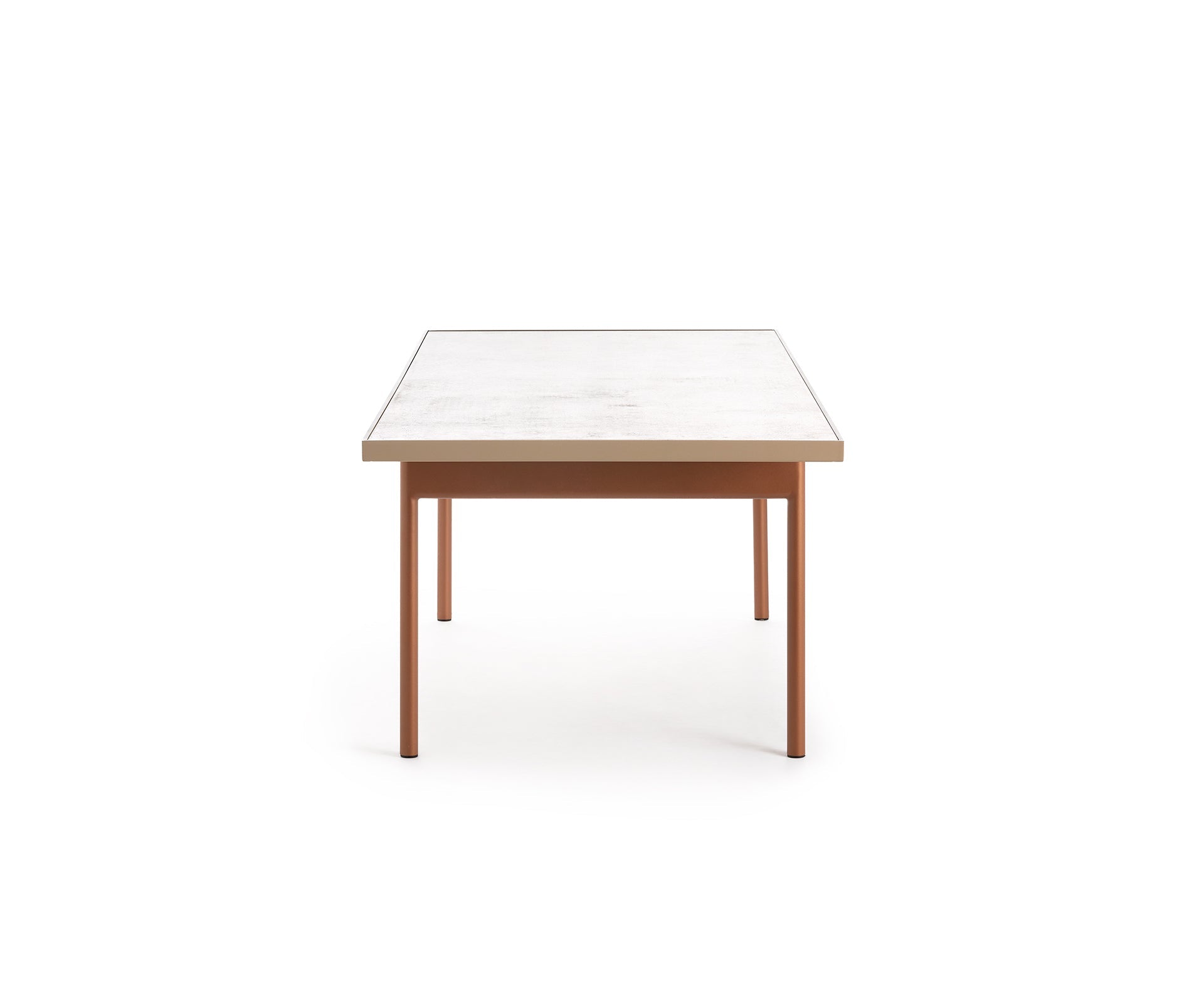 The ONDE dining table is a designer table with a welded aluminium structure and corrugated aluminium sheet finished in a high-quality powdered paint, ideal for outdoor applications. Its top is made with the innovative ultra-compact surface, Dekton® by Cosentino, highly resistant to scratches and stains and whose colour does not fade over time thanks to its resistance against ultraviolet (UV) rays.