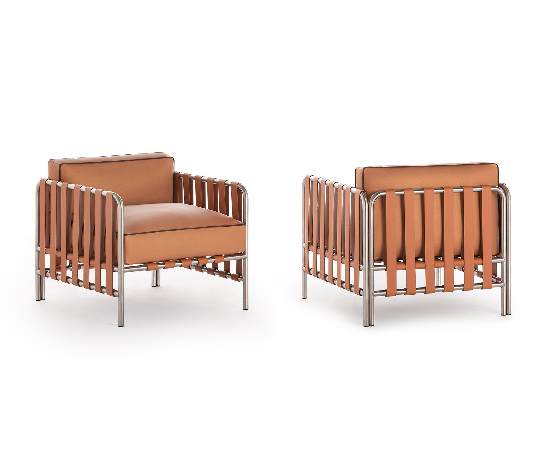 The ONSEN club chair is a designer armchair with a manually welded tubular stainless steel frame and leather-look webbing on the arms, backrest, and seat. The properties of these vinyl straps -resistant to fungi, stains, and fire retardant- complement the finishes for outdoor use. The piping that decorates its cushions provides identity and exclusivity.