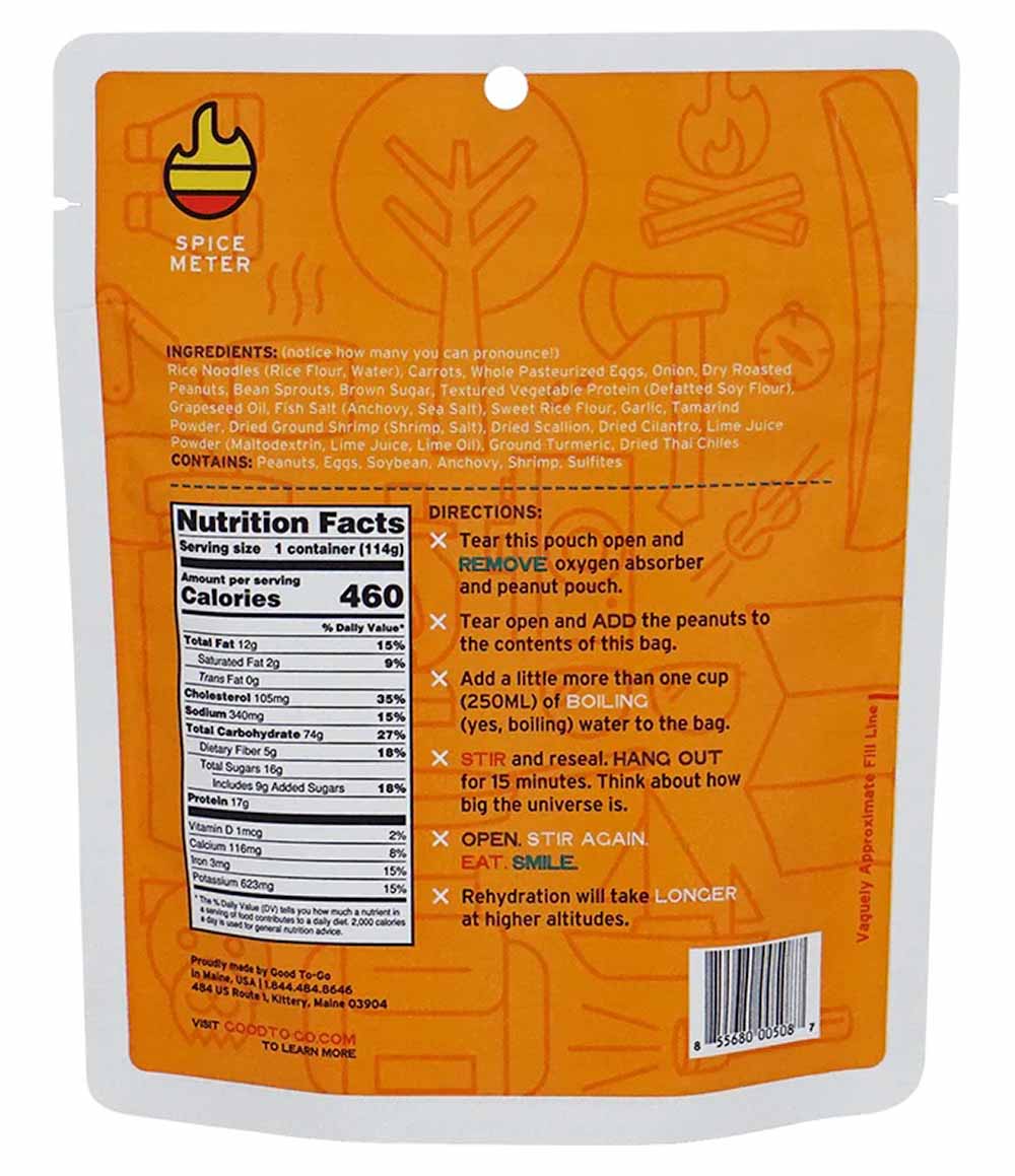 Ingredients (notice how many you can pronounce!) — Rice Noodles (Rice Flour, Water), Carrots, Whole Pasteurized Eggs, Onion, Dry Roasted Peanuts, Bean Sprouts, Brown Sugar, Textured Vegetable Protein (Defatted Soy Flour), Grapeseed Oil, Fish Salt (Anchovy, Sea Salt), Sweet Rice Flour, Garlic, Tamarind Powder, Dried Ground Shrimp (Shrimp, Salt), Dried Scallions, Dried Cilantro, Lime Juice Powder (Maltodextrin, Lime Juice, Lime Oil), Ground Turmeric, Dried Thai Chiles.