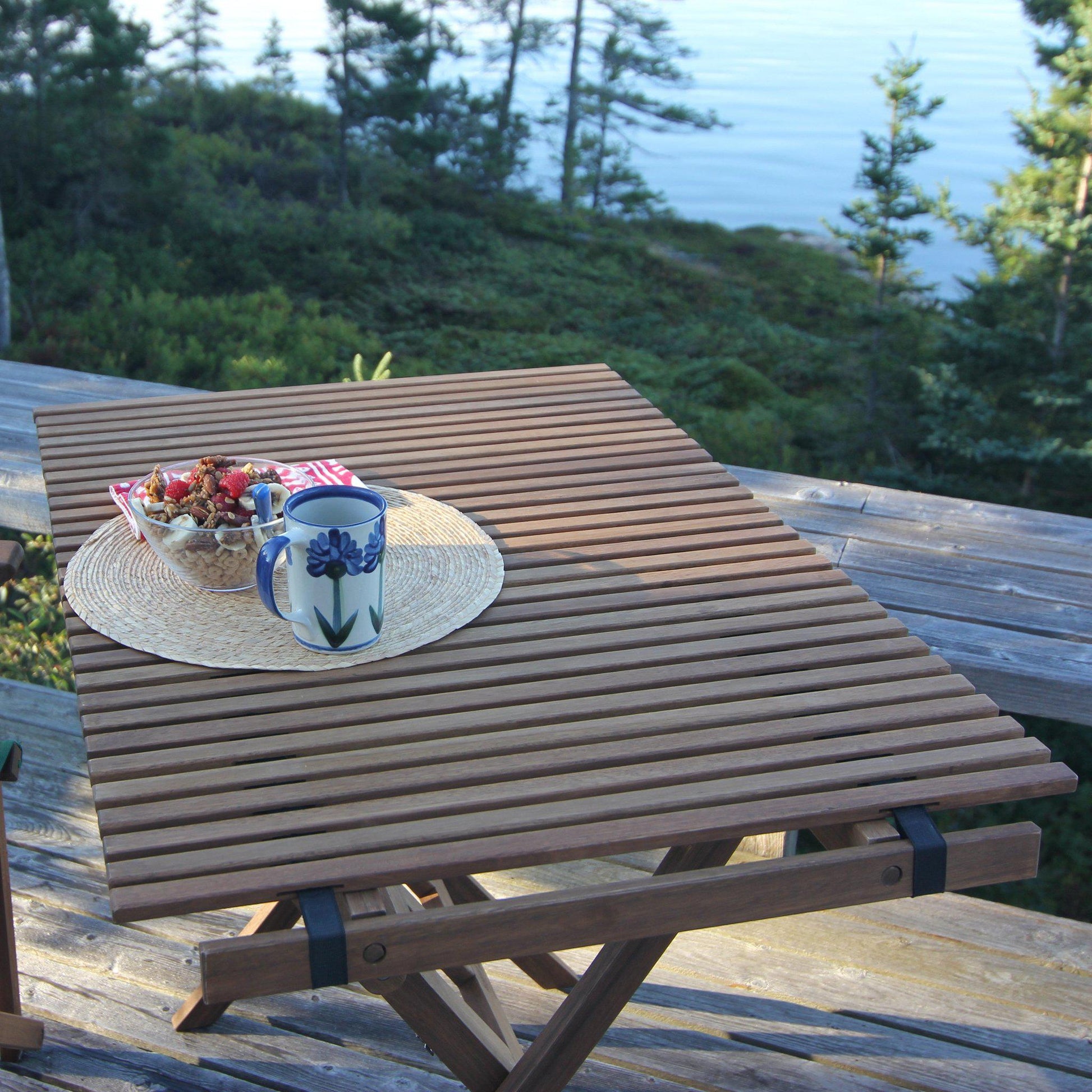 Inspired by the chairs and tables produced here in Maine for many years, the Campaign Roll Top Table is a strong, beautiful deck or patio table produced by one of our worldwide partners in the central highlands of Vietnam.Recently redesigned to more comfortably accommodate four adults, the Roll Top Table is crafted from strong Keruing wood indigenous to Southeast Asia, with an exterior penetrating oil finish designed to resist moisture and provide long life. The table comes with a carrying bag for easy transport.