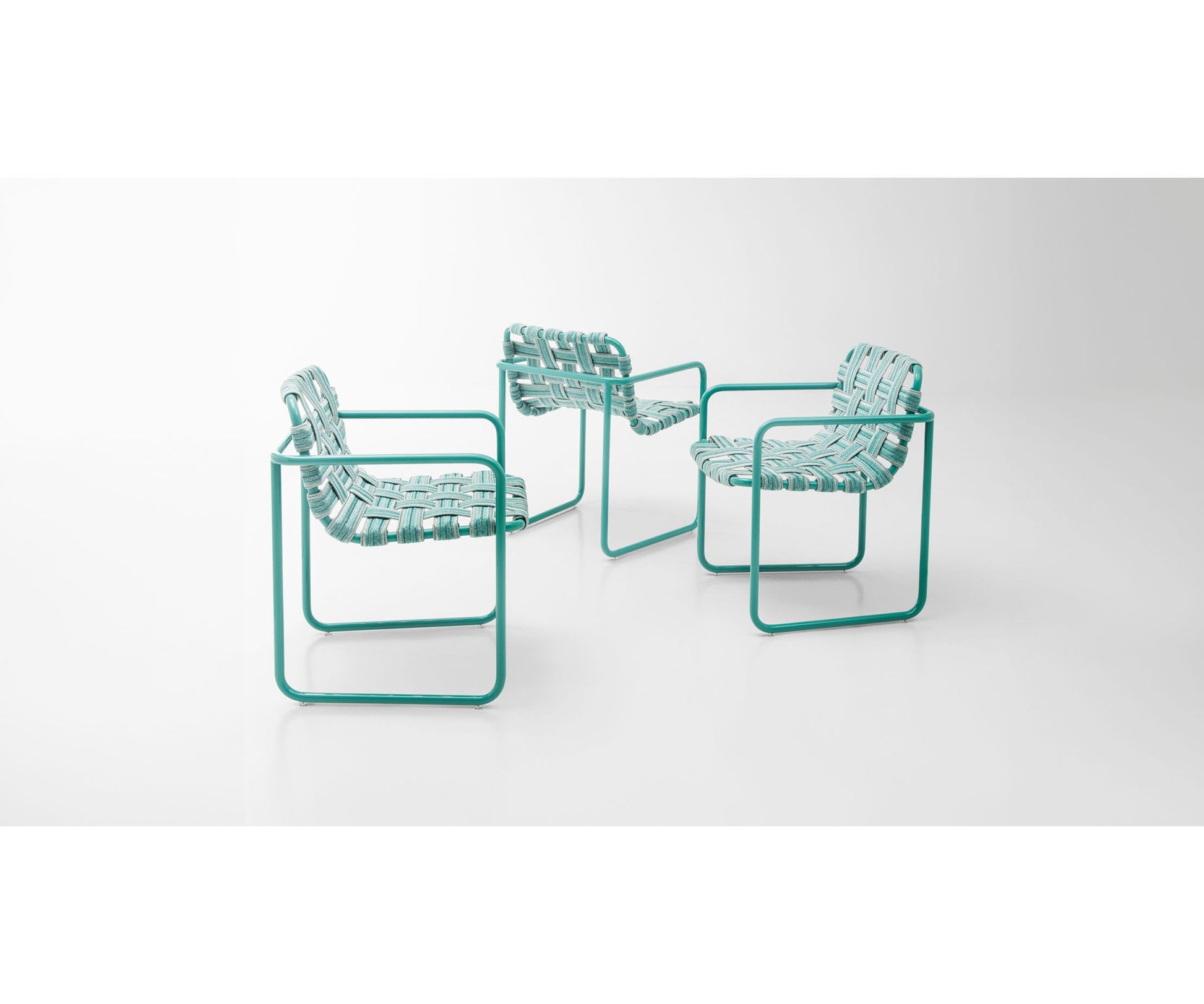 Upholstery: fixed and hand woven with two-colour elastic belts, with a width of about 7 cm, in Rope yarn woven so as to decorate the surface, or with mélange elastic belts, with a width of about 7 cm, covered with a braid in Rope yarn.