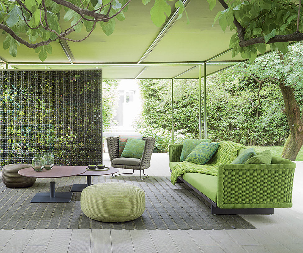 The Cristal tops are made by interposing a layer of fabric between two sheets of transparent extralight tempered glass. The edges of the tops is sealed to allow safe use in outdoor environments.