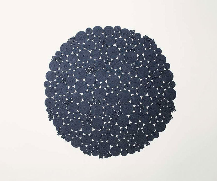 The cord is wound and sewn by hand to create spirals and stylized patterns; these elements are sewn together in free combinations to form the rug.
