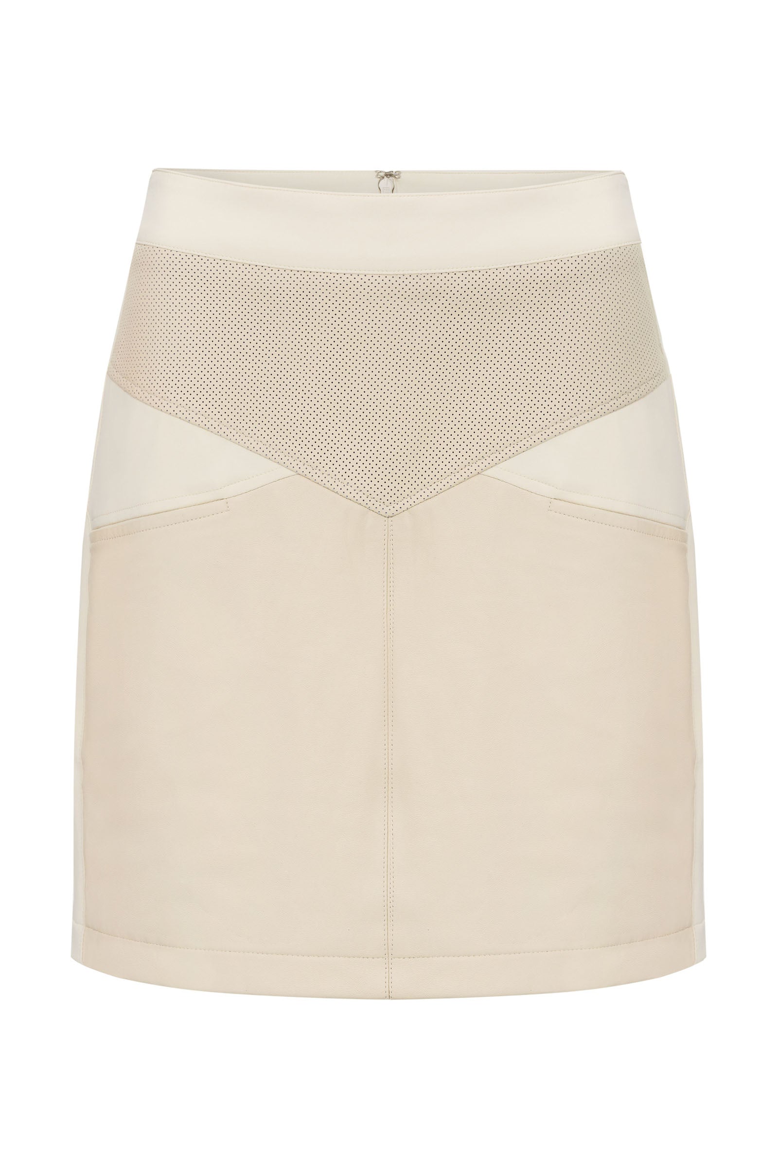 The Pearl skirt is designed to move with you, blending leather panels with soft performance stretch fabrics, and available in two color options. Pair it with the matching Erin Jacket for a stylish leather ensemble.