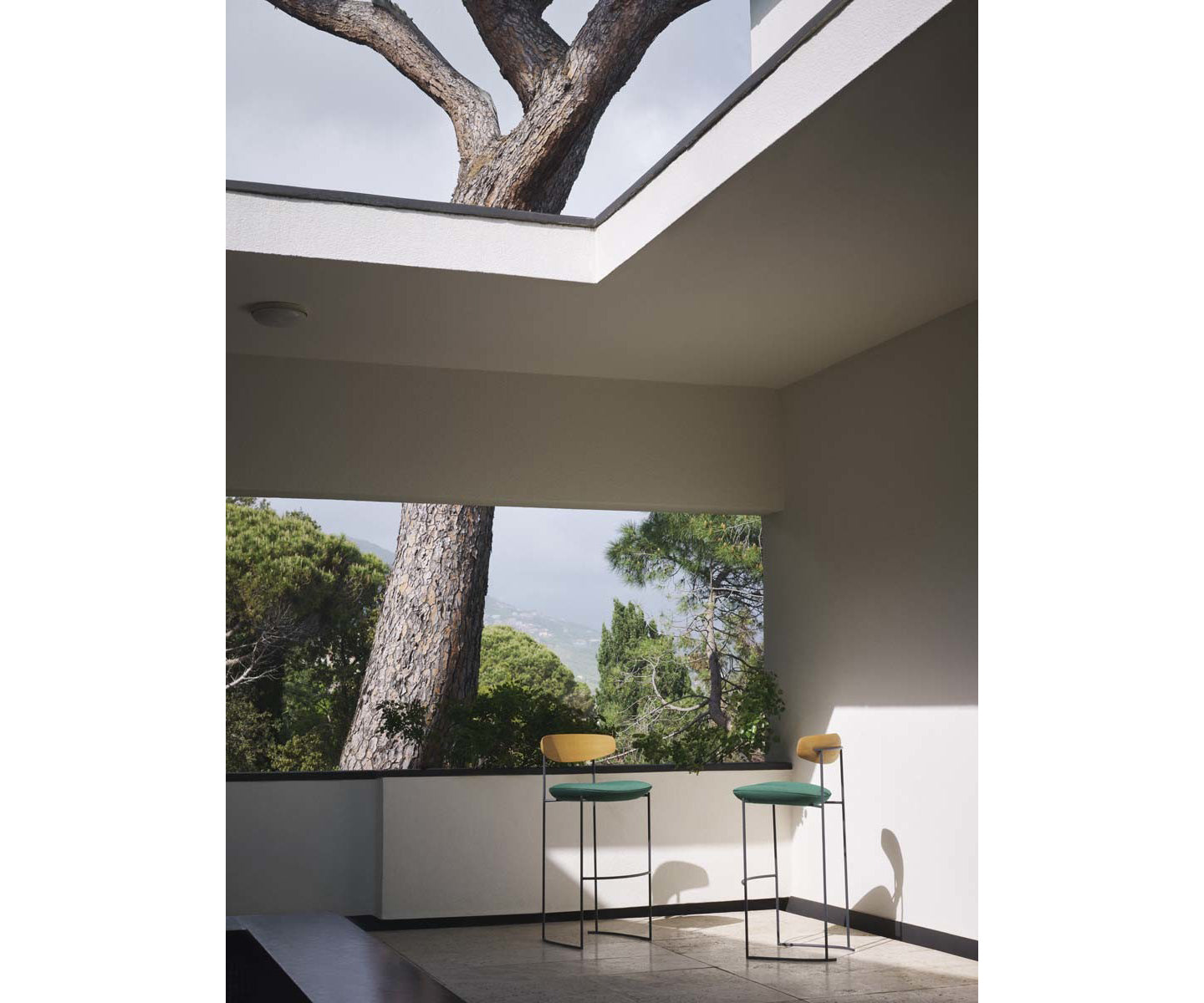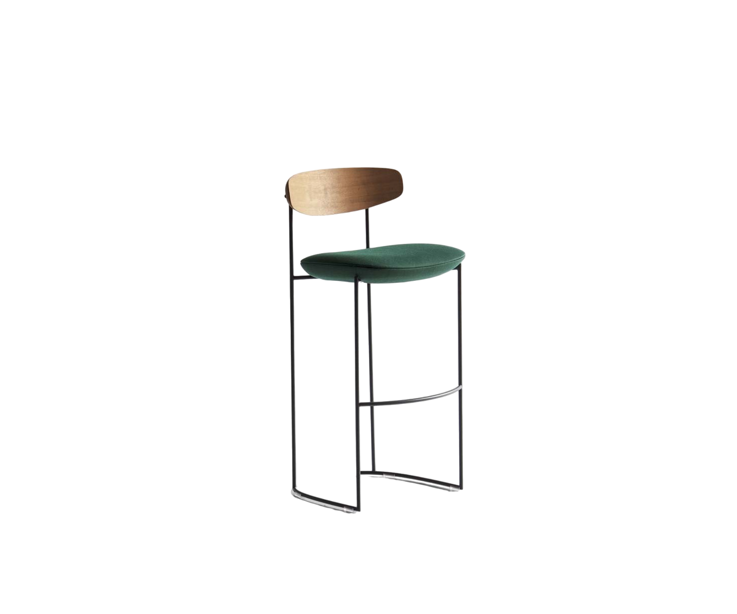 The Keel stools in two-heights, part of the homonymous collection consisting of chair, small armchair and armchair, have a linear structure in metal rod, an enveloping backrest in solid wood and padded, soft and sinuous support elements.
