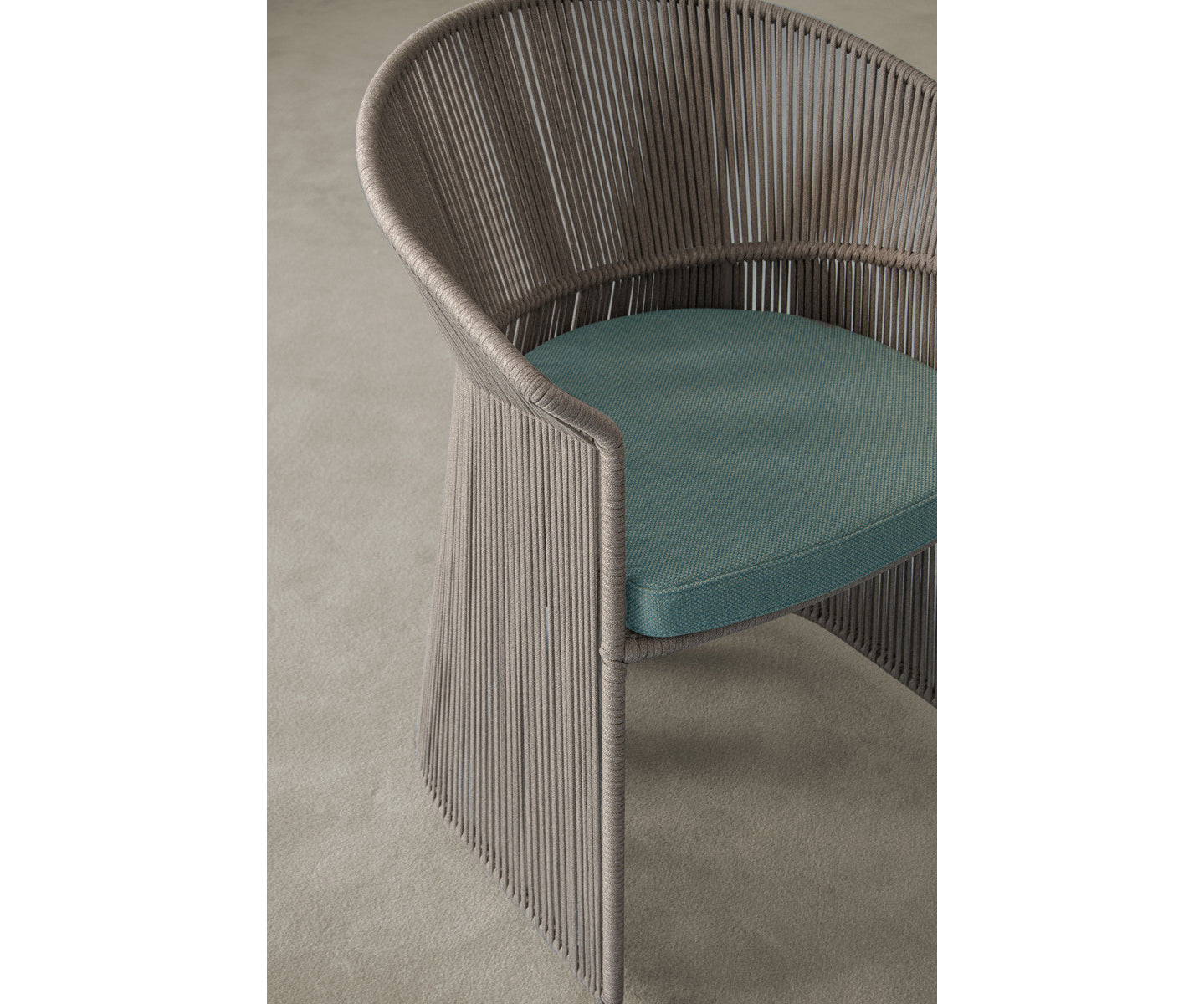 The structure in powder coated metal rod for outdoor use is entirely hand-woven in Fly ribbon. The legs are in painted AISI 316 stainless steel. The seat cushion, removable and detachable, is padded with fire retardant polyurethane foam. The underlining is waterproof with sealed seams and final lining in the outdoor coverings available as per collection.