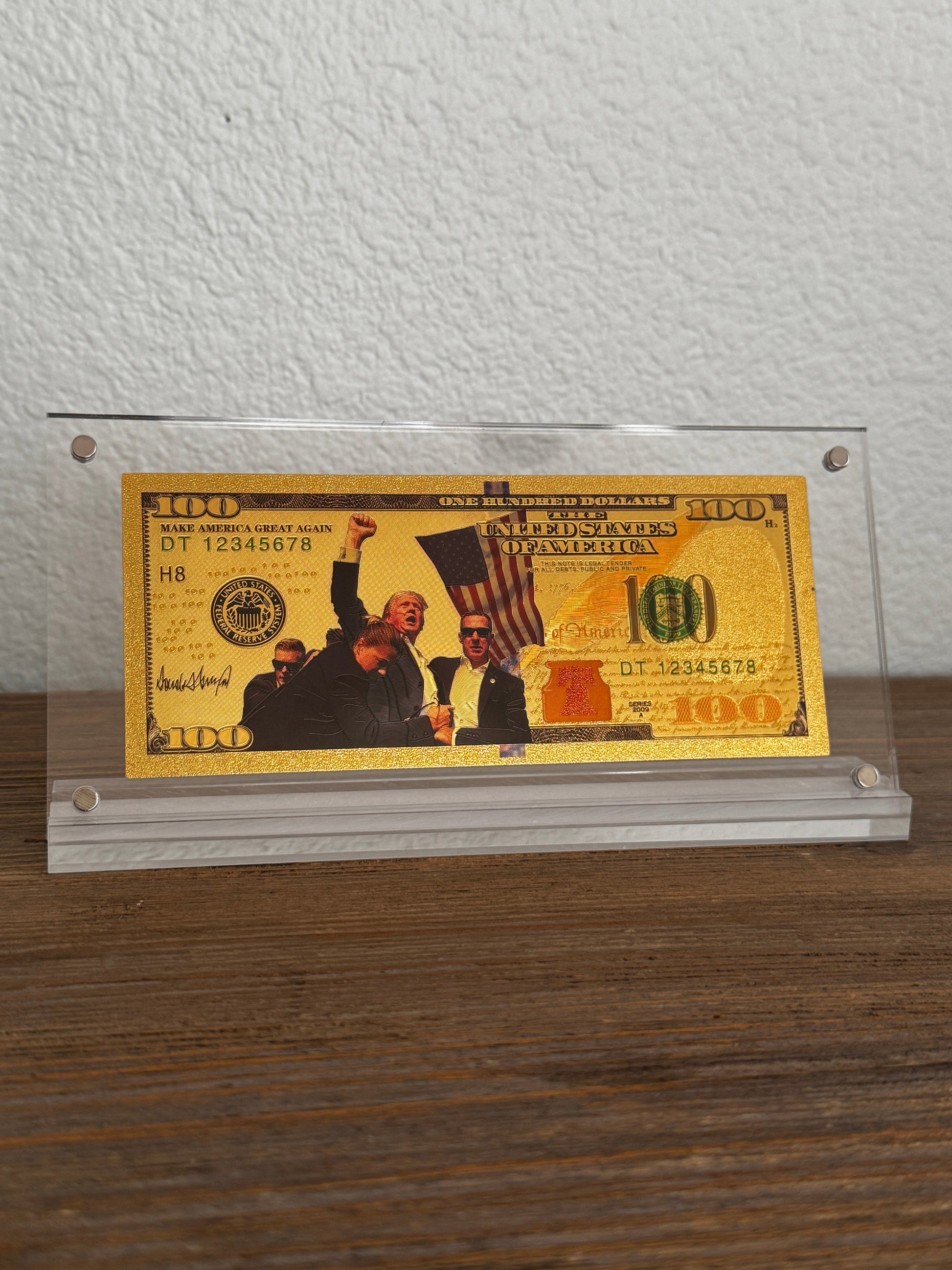 This limited edition President Trump Gold Foil Embossed $100 Bill is a unique and striking piece of memorabilia. It features intricate embossing and genuine gold foil, making it a valuable addition to any collection. Show your support for the 47th President and own a piece of history with this beautifully crafted bill. ( For those that need this message.. The bills are not real currency thank you)