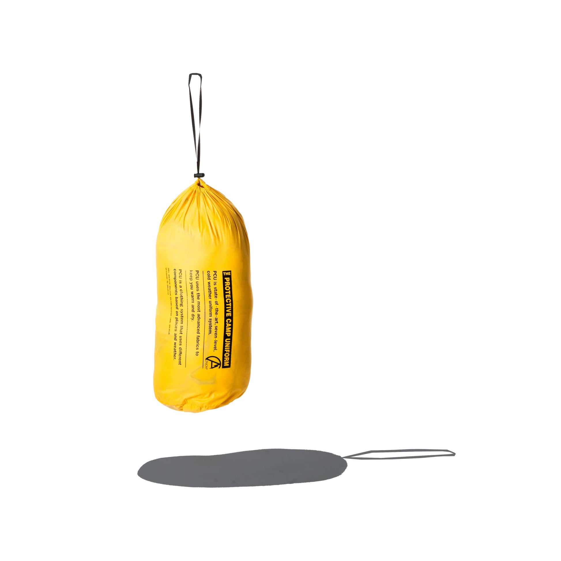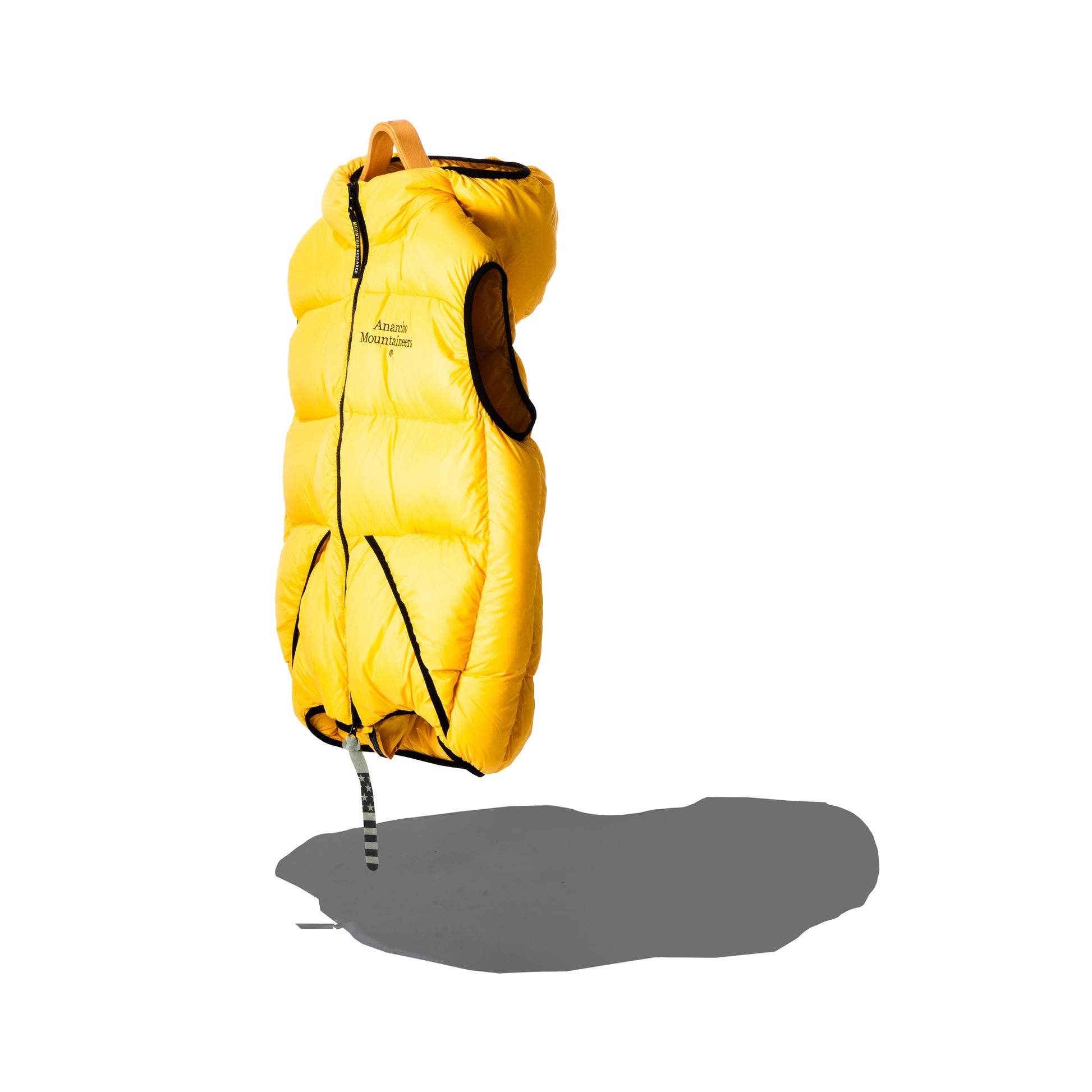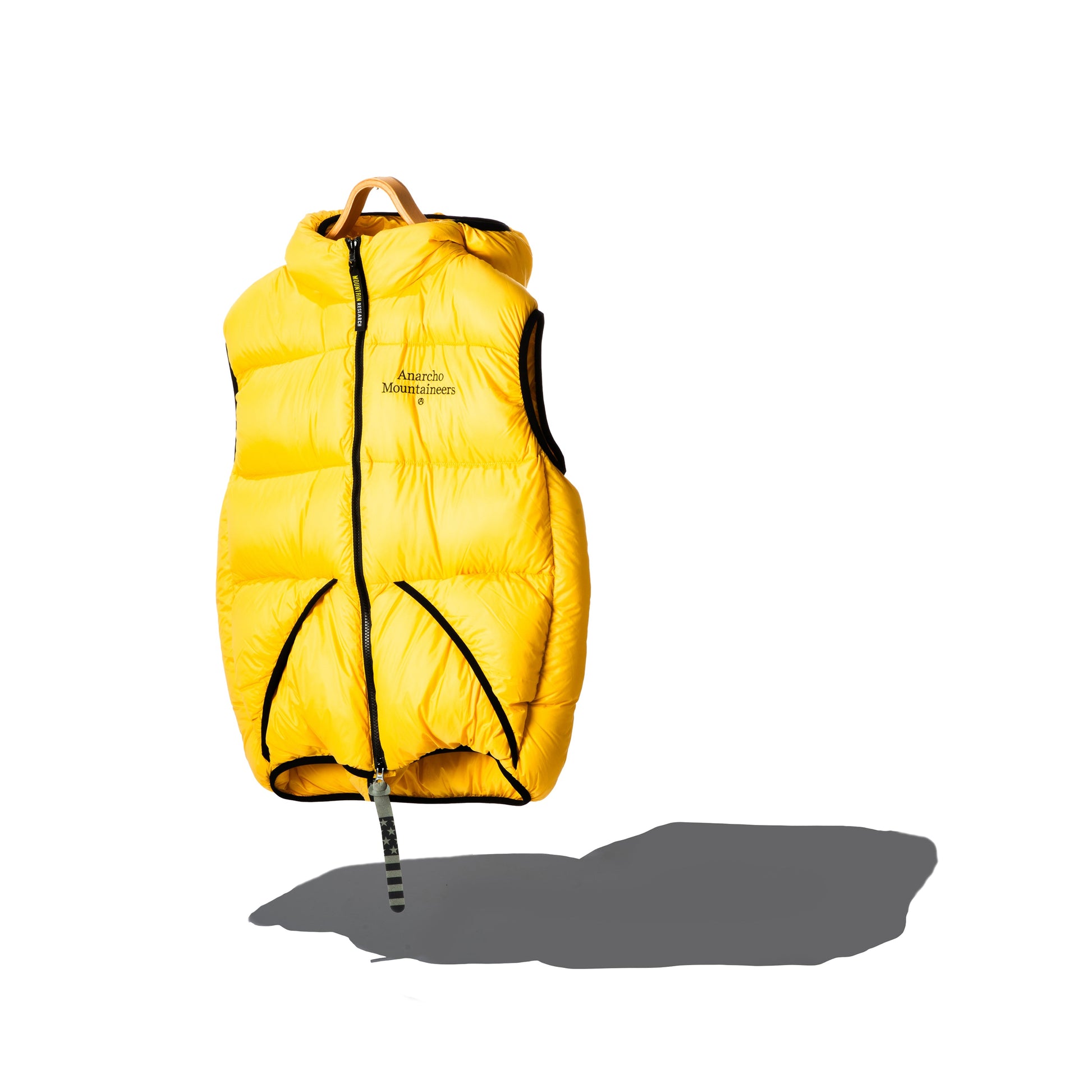 This down vest, in collaboration with TAION, features elastic binding for enhanced warmth. Made with 800 fill power white duck down, it boasts a smooth, lightweight recycled nylon body and iconic A.M. embroidery on the left chest. The removable hood adds versatility, and it comes with a special stuff sack featuring a P.C.U. print.