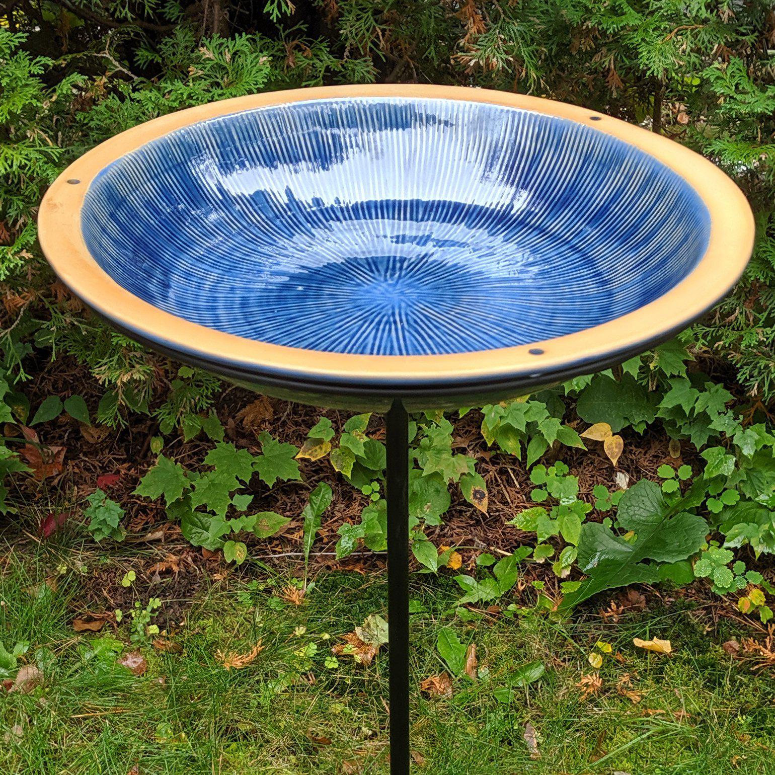 The Alcyon Radial Bird Bath is a made from durable and attractive porcelain stoneware designed to withstand outdoor exposure. The brilliant reflective glaze accentuates the concentric circle design. Mounted on a sturdy powder-coated steel post, it will look stunning in your backyard or garden.