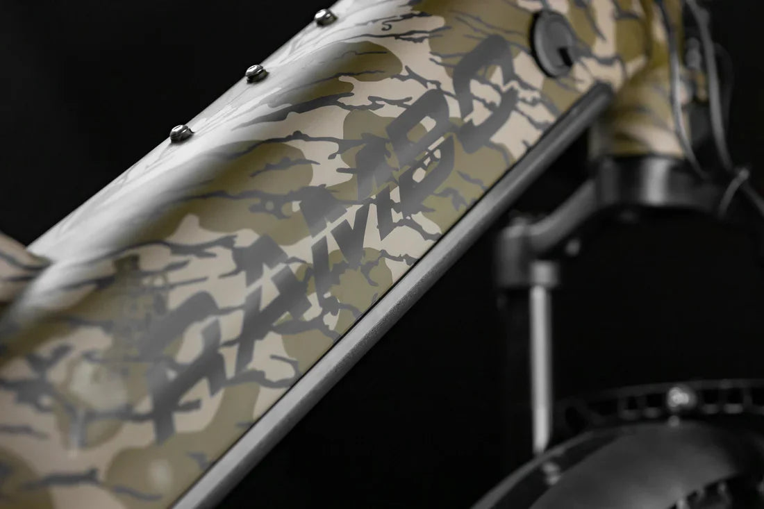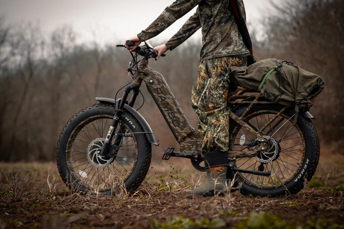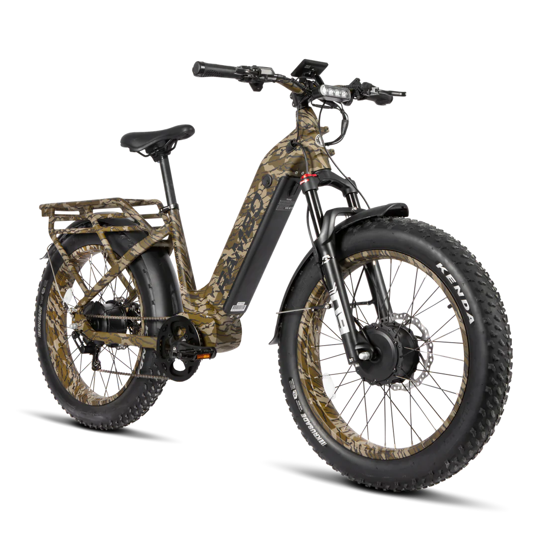 A MIDWEST FAVORITE! The Krusader 3.0 stands as the original all-wheel drive bike in the fat tire hunting world, continuously improving with time. Powered by two 500w motors, it delivers the strength of a 1000w bike, distributed evenly between both wheels. As a top seller for four consecutive years, it's a beloved choice among Midwest hunters. The Krusader 3.0 comes equipped with an AWD-specific LCD display, featuring battery level, trip details, run time, speed, wheel engagement, and RPM per motor. New for 2024, it includes an integrated rear rack, full HD front and rear fenders, and a custom LED headlight. Notable upgrades also include handlebar-mounted switches for easy adjustments to the custom drive system and headlight.