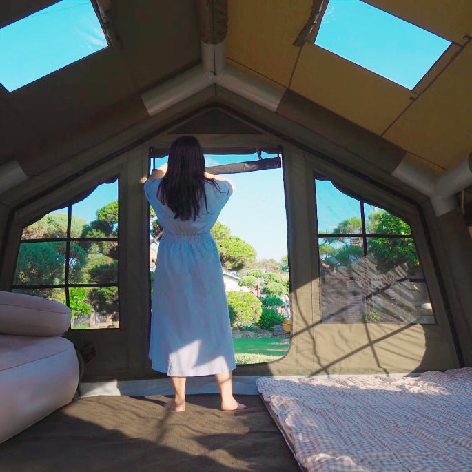 Premium Inflatable Tent "Koala Air Tent 7" is equipped with five-layer windows, which can be used for additional ventilation. However, if you want to make sure that the tent is thoroughly ventilated, you can always check out our camping fan. It is a great accessory that will help you maintain even temperatures inside the tent.
