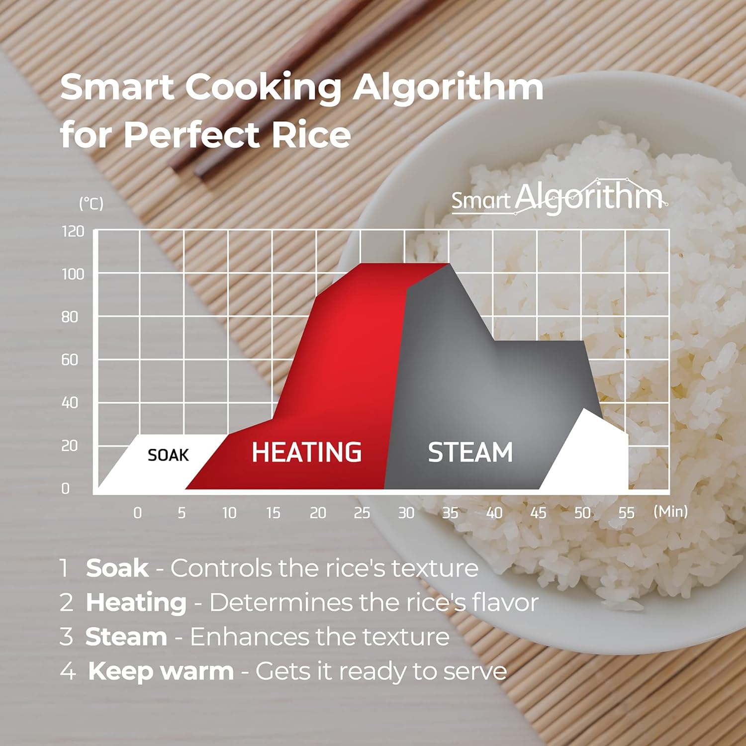 - SMART TECHNOLOGY: Features an energy-saving smart algorithm that automatically detects the grain type and internal temperature and an automatic keep-warm mode, effectively taking the guesswork out of perfectly cooked rice