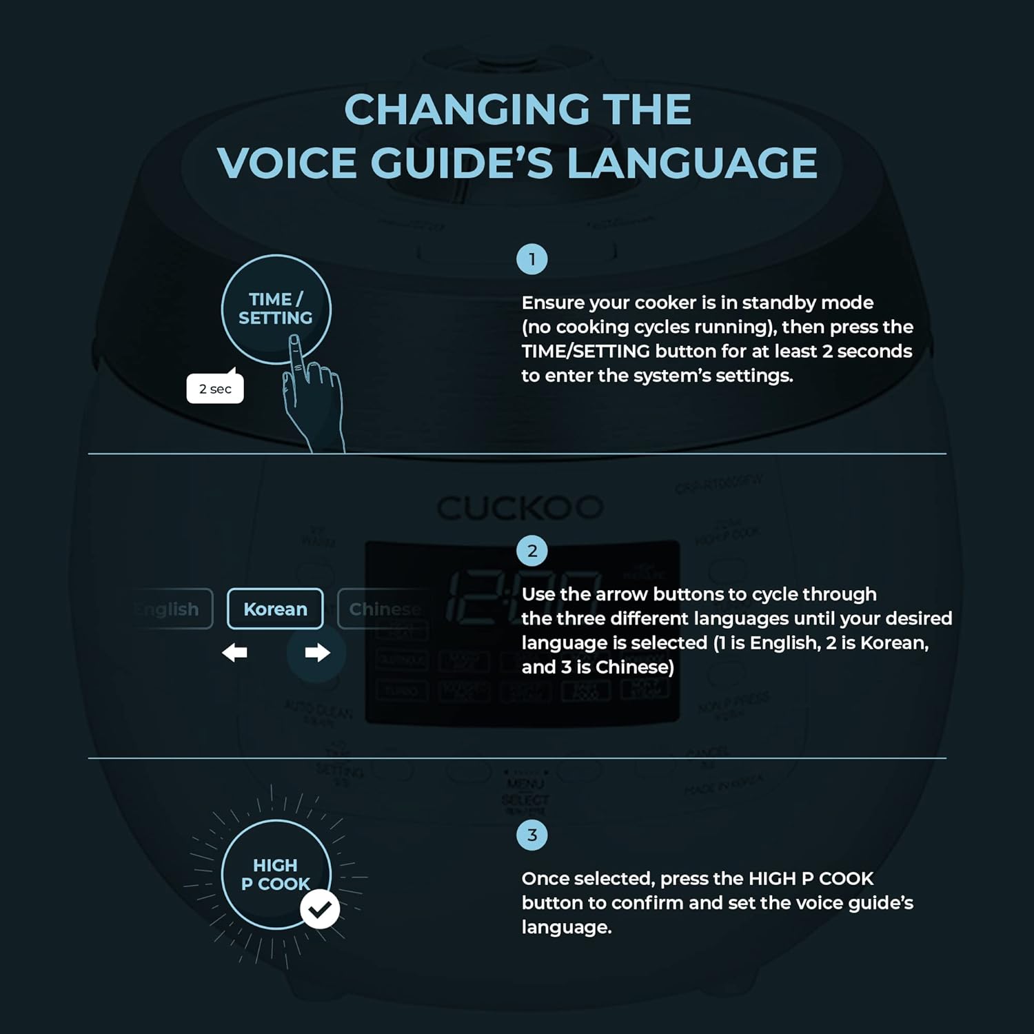 - VOICE GUIDE: Complete with voice navigation in 3 different languages (English, Chinese, and Korean), this cooker will act as your personal kitchen assistant as it cooks, and you relax