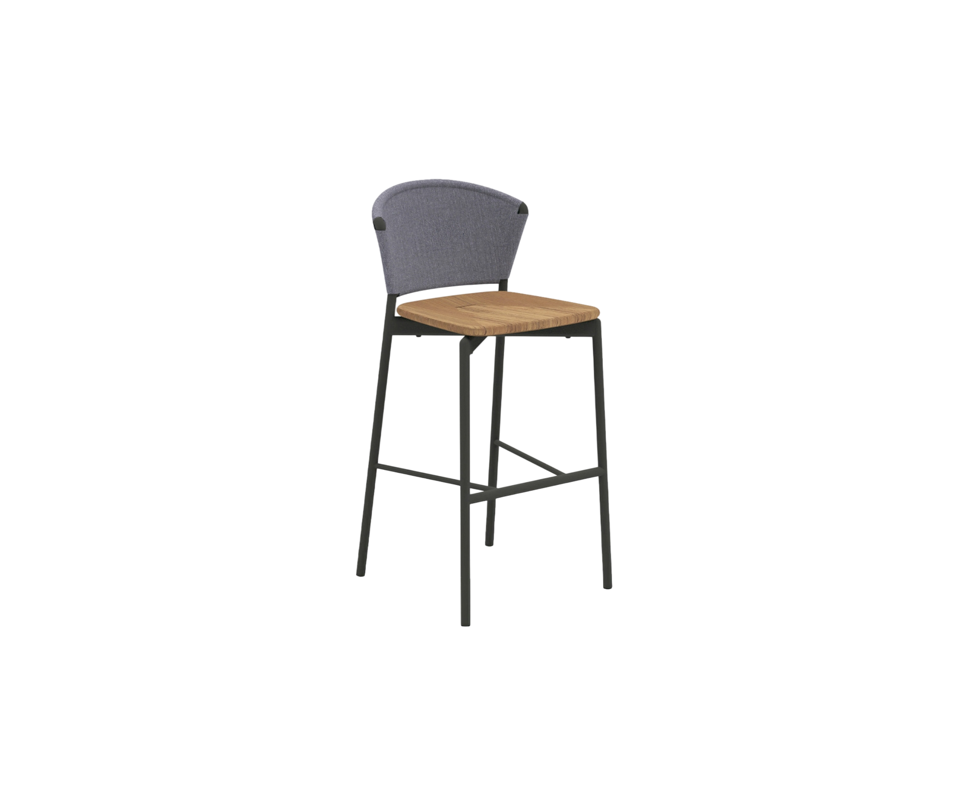 Made with a solid aluminium structure, the PIPER barstool offers a rich choice in terms of materials and colours for the backrest, from the belts in polyester or acrylic fibre to the soft padded belts or the Batyline. The seat can be personalized in teak or in polyurethane resin with an optional cushion.