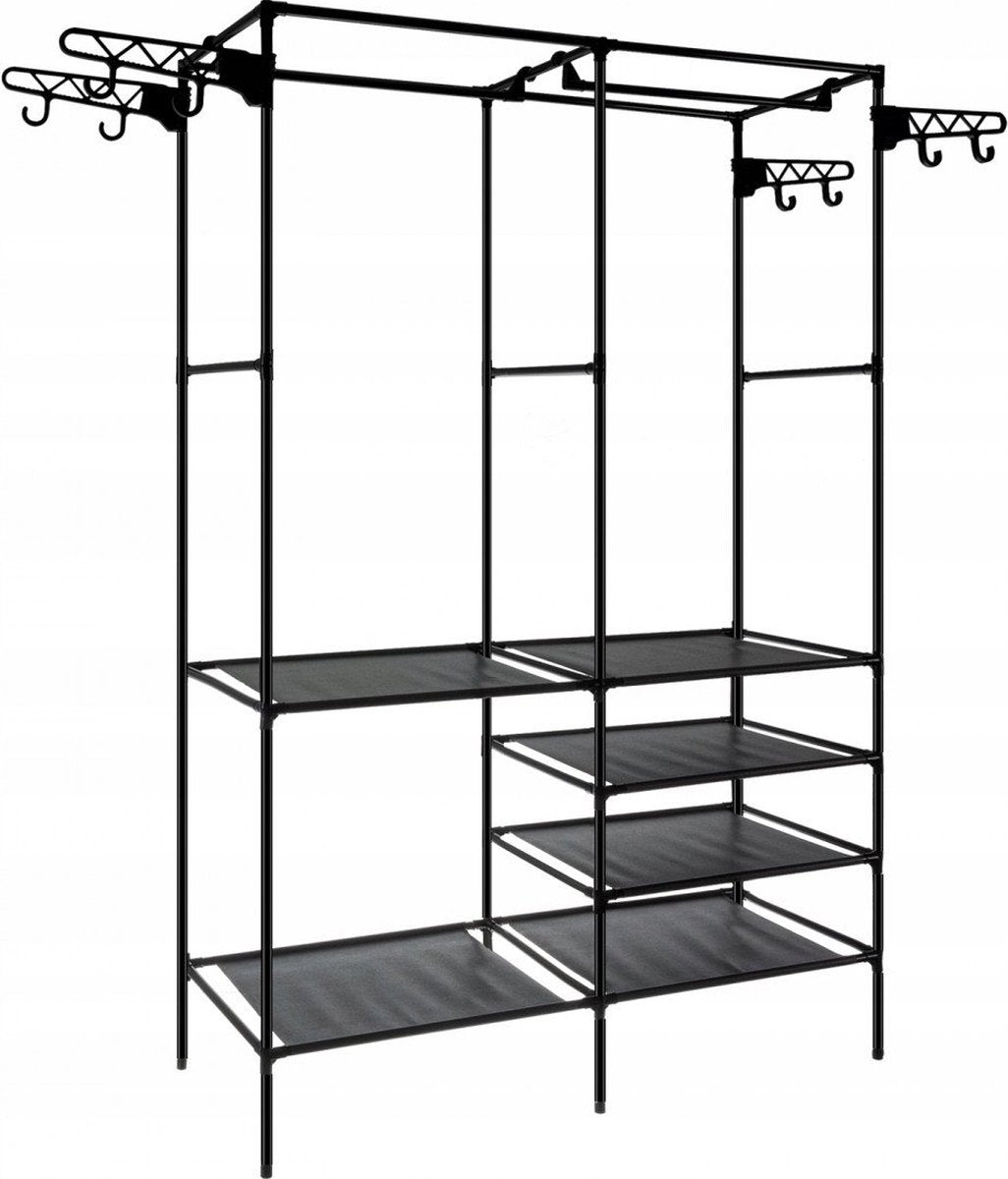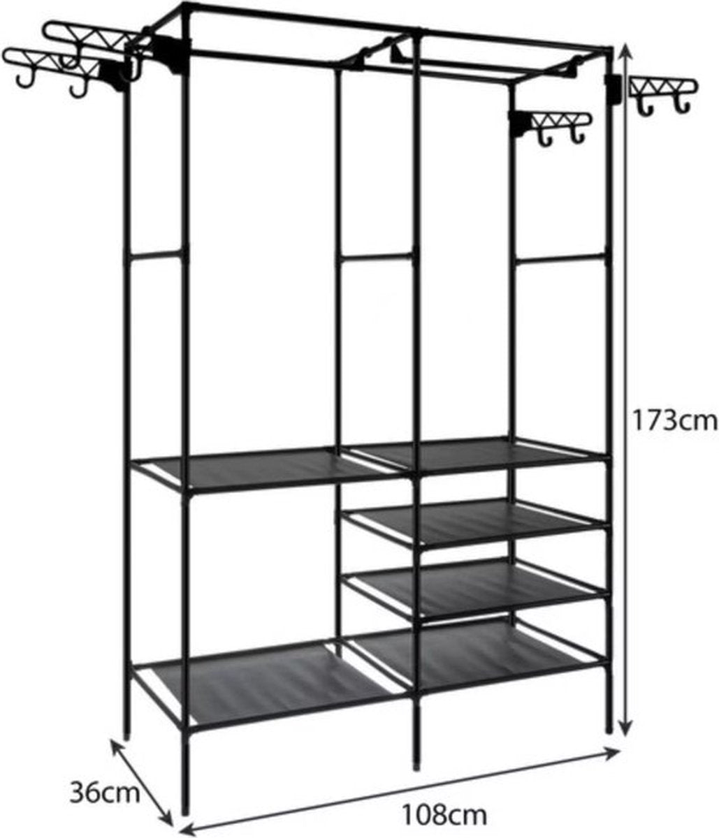 Met zijn XXL-formaat biedt het kledingrek 6 planken, een hangstang en 8 zijhangers, waardoor het ideaal is voor het efficiënt organiseren van je kleding. Of je nu een tijdelijke woonoplossing hebt of in een kleinere woning woont, dit praktische kledingopslagrek biedt de perfecte combinatie van functionaliteit en ruimtebesparing.