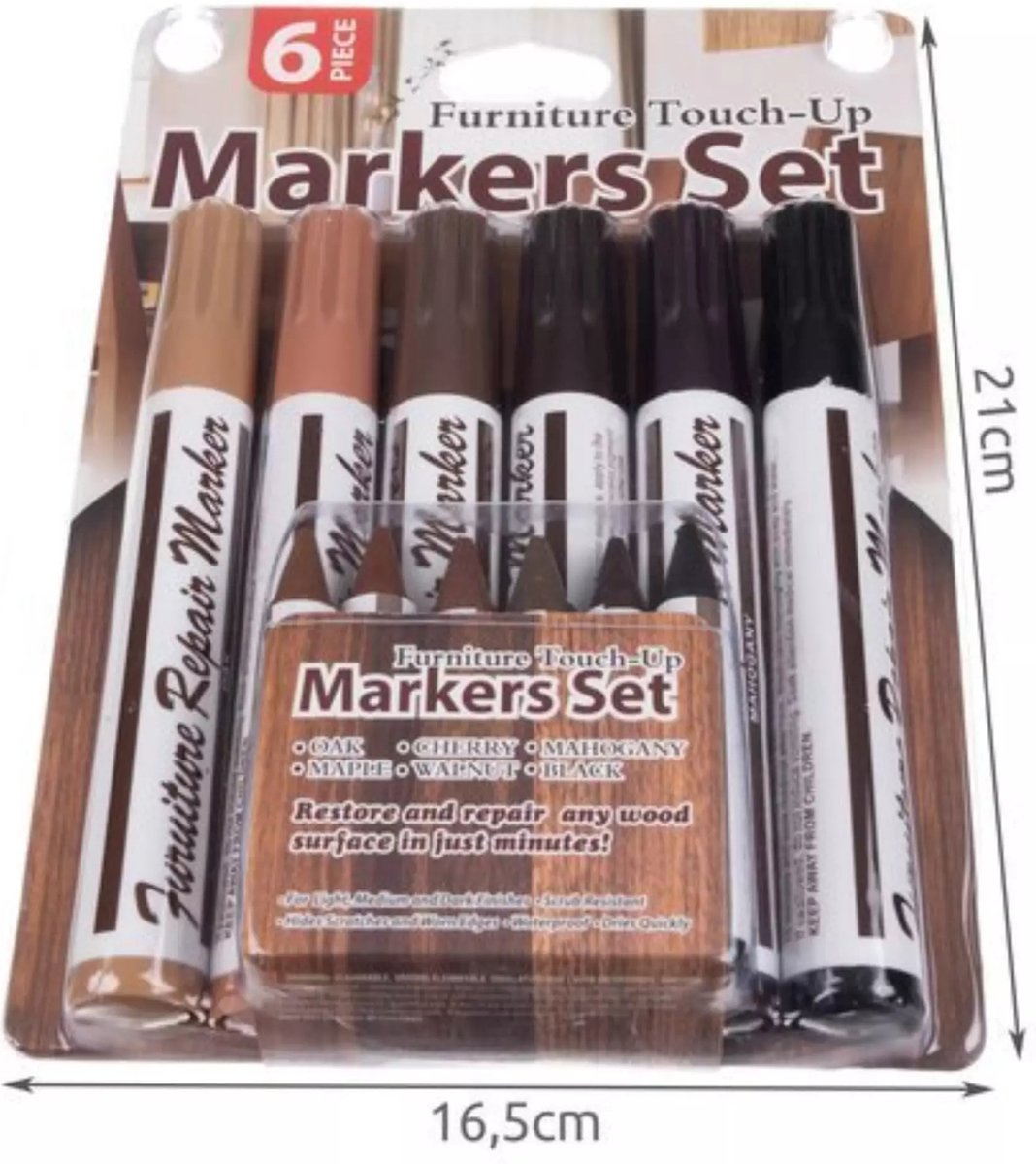 De set bevat 6 markers en bijpassende waskrijtjes in de meest gebruikte houtkleuren: