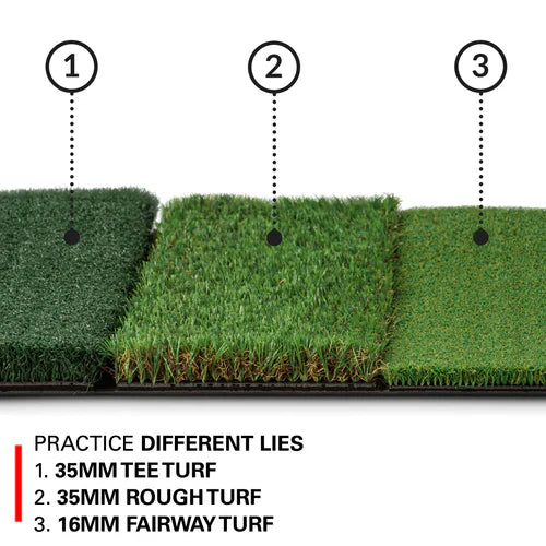 Tri-Turf Portable Folding Mat with no skid base: 16mm Putting Green, 35mm Rough turf, 35mm Tee turf, 2mm Nature Rubber as well as large Chipping target for complete at home practice sessions