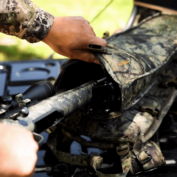 The Bolt Action Scabbard is a padded and reinforced sleeve that carries and protects most bolt action rifles while keeping them at an arm's reach. In addition, the use of the Bolt Action Scabbard allows the user to keep their hands free, improving balance, safety, and comfort. In most cases, the scabbard also positions the weapon directly behind the head so that it may be drawn without the removal of the wearer's pack.
