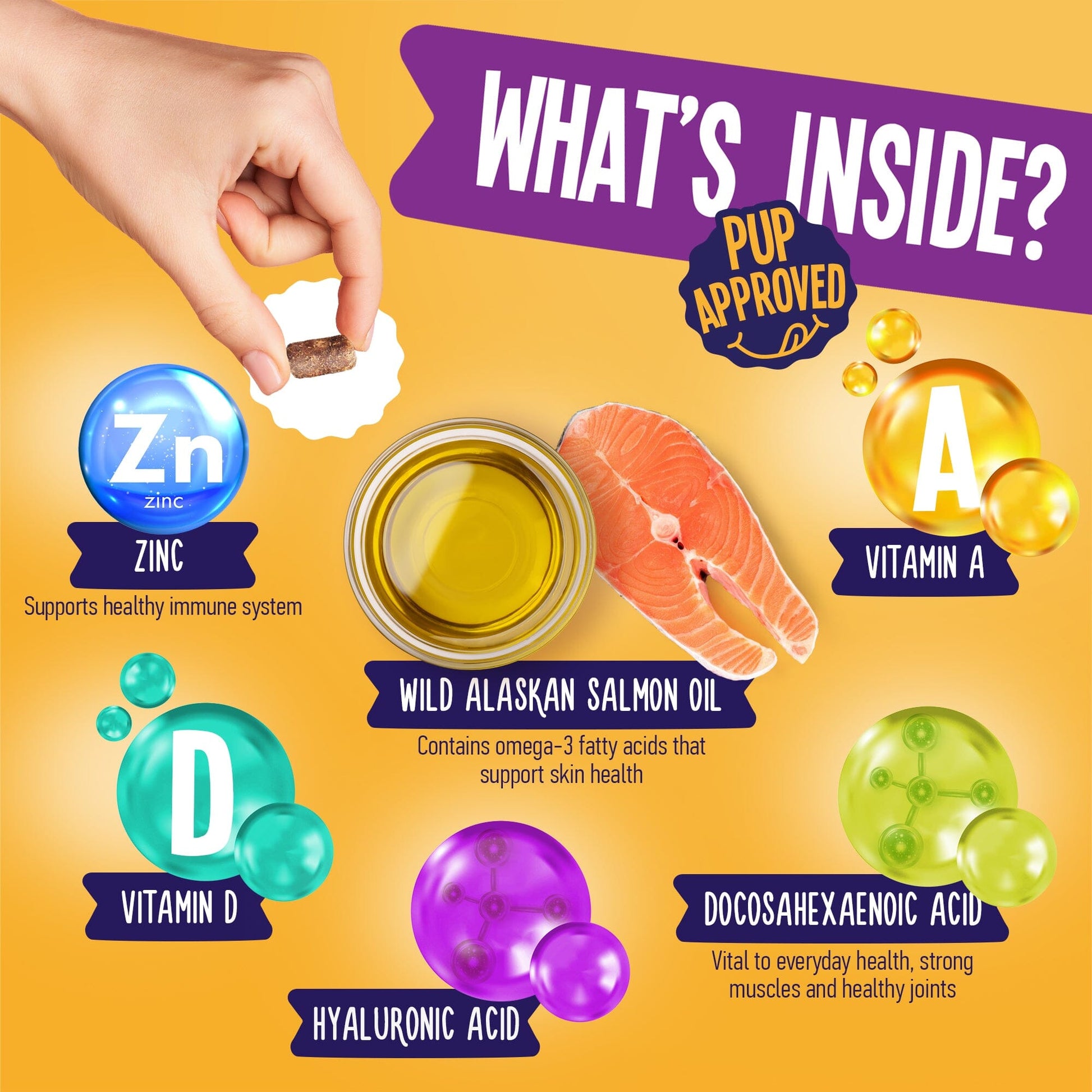 Multi-Level Benefits: Thanks to its well-balanced content, our skin and coat chews for dogs can also help support immune system, and promote strong muscles and healthy joints!