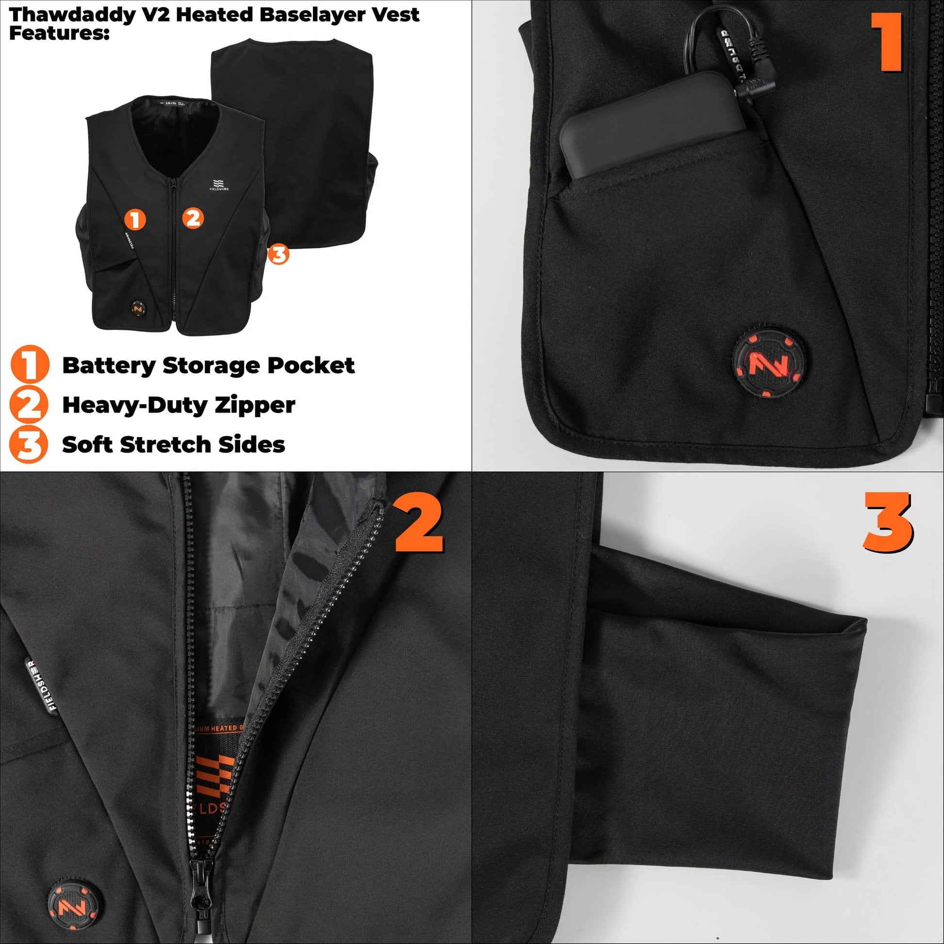The Smart Thawdaddy 2.0 BT Heated Vest is an essential piece of equipment for any outdoor enthusiast, from cold hikes in the mountains to long days spent riding rolling hills or finding backcountry powder. Due to the increased accessibility offered by the front zipper, the Thawdaddy is the perfect addition to any outdoor equipment kit. This rugged outer layer not only keeps you warm and dry but lets you keep getting after any outdoor pursuit longer, from long days on the slope to trips backcountry tracking. Keep at it longer with Fieldsheer’s powerful Mobile Warming® heating technology combined with the highest quality materials and thoughtfully designed to keep you warm, dry, and comfortable for hours without forfeiting range of motion, style, or performance. Heated vests are among our most popular heated apparel due to their flexible function and easy storage, which is taken one step further with our compact engineering.