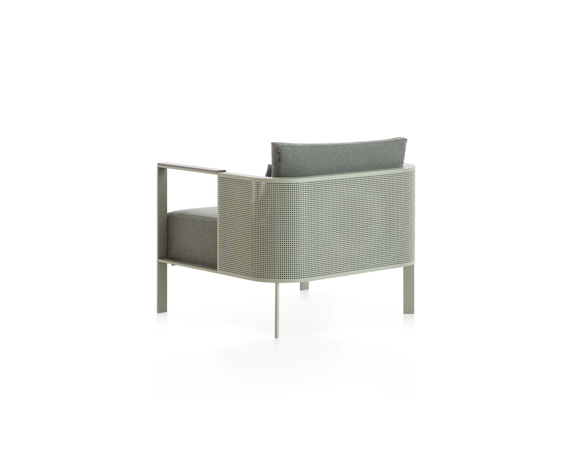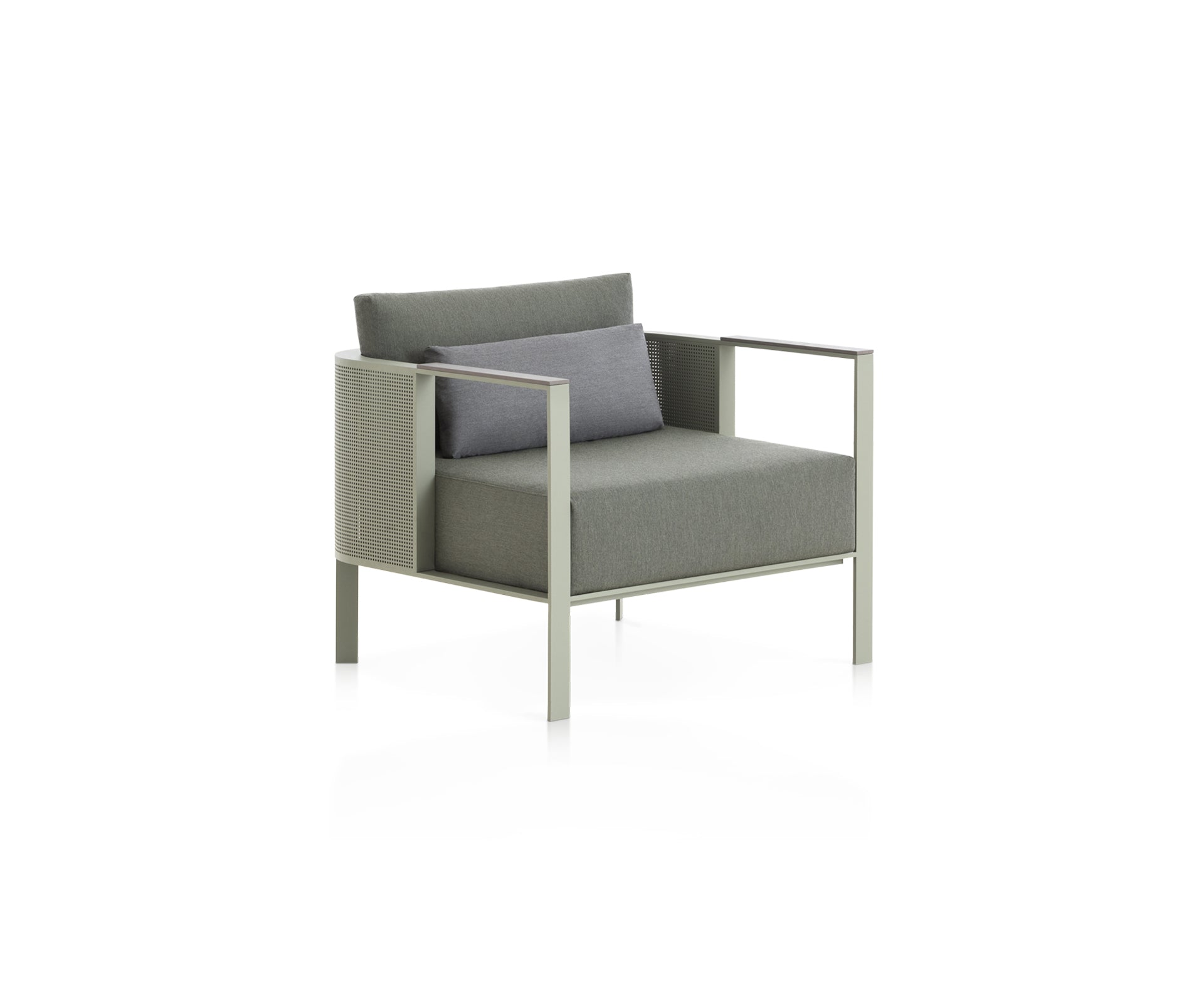 This designer lounge chair is part of SOLANAS, the outdoor furniture collection manufactured using welded aluminum profiles and the ultra-resistant material Dekton® by Cosentino. It is a very comfortable outdoor lounge chair. The voluminous cushions are made of polyurethane foam protected with water-repellent fabric, and its covers are removable.