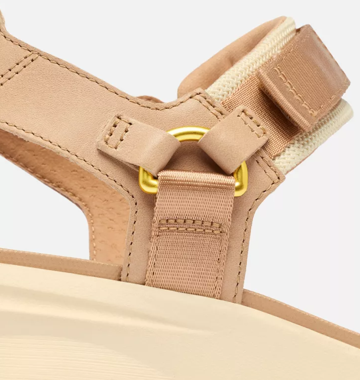 - UPPER: Secure leather forefoot strap. Adjustable hook and loop mesh midfoot strap with webbing detail. Leather strap with foam detail for comfort around heel. D-ring detail with leather and webbing on lateral side.