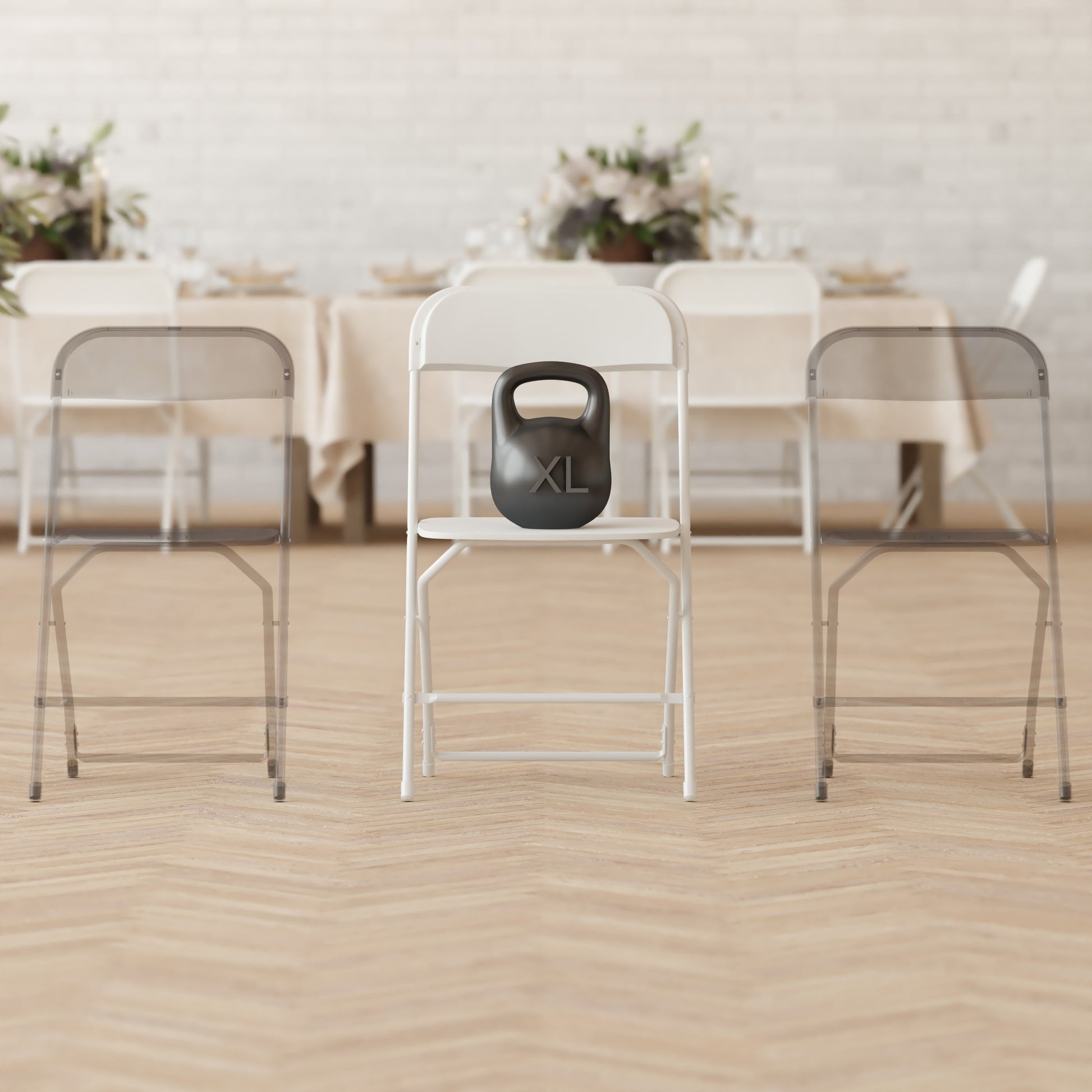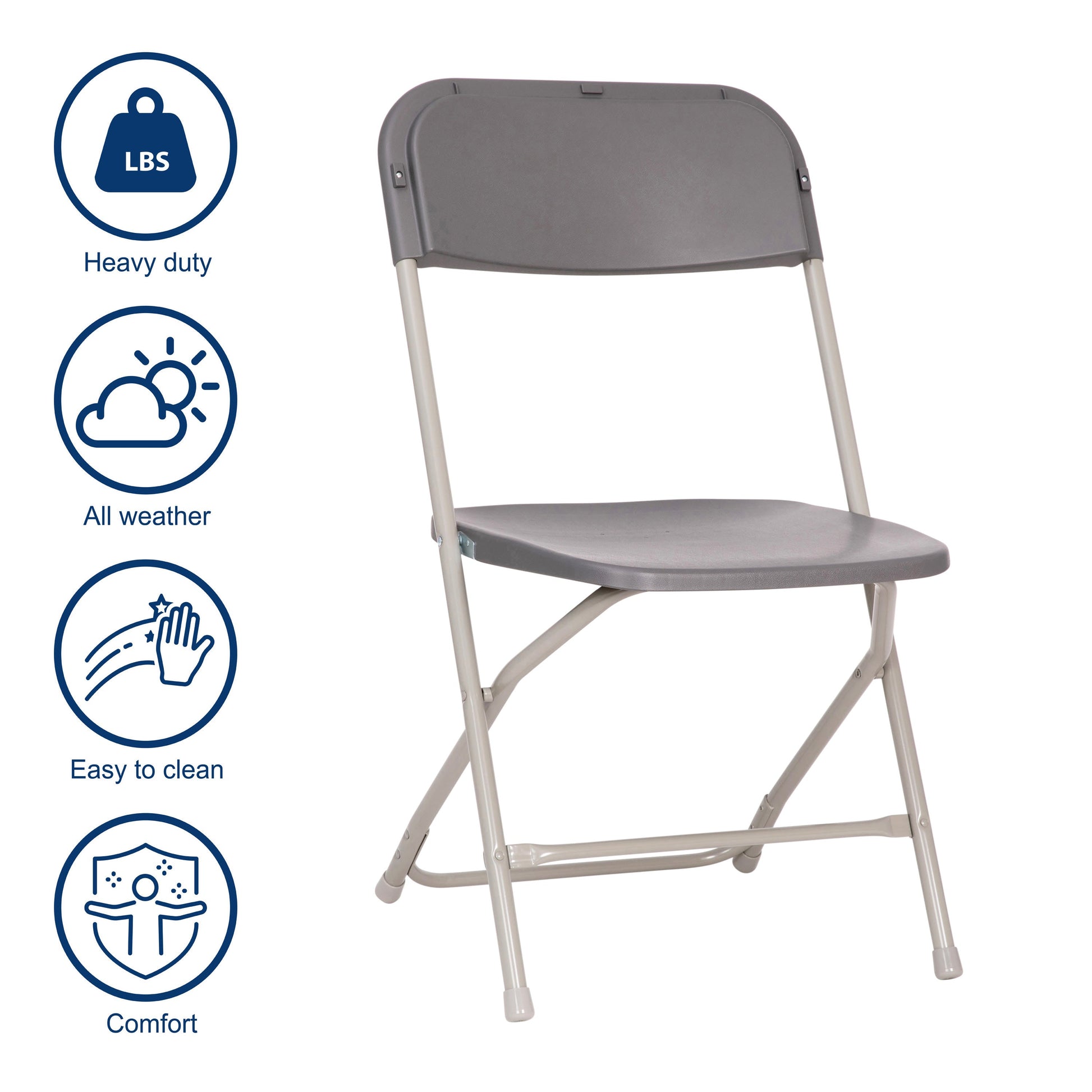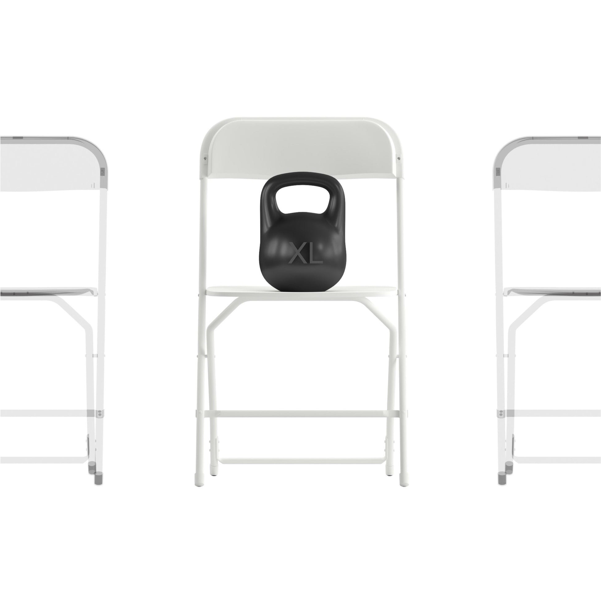 Durably constructed and built to last, the reinforced steel frame along with the high impact plastic back and seat hold up to 650 lbs. static weight while non-marring floor caps protect your indoor flooring surfaces from scuffs and scrapes. The nesting design allows you to stack these party and event chairs up to 50 high from the floor or can be paired with our chair dolly for convenient storage and transport. With a variety of color options, this high capacity foldable chair is ideal for weddings, school functions, barbecues, game night, and catering events.
