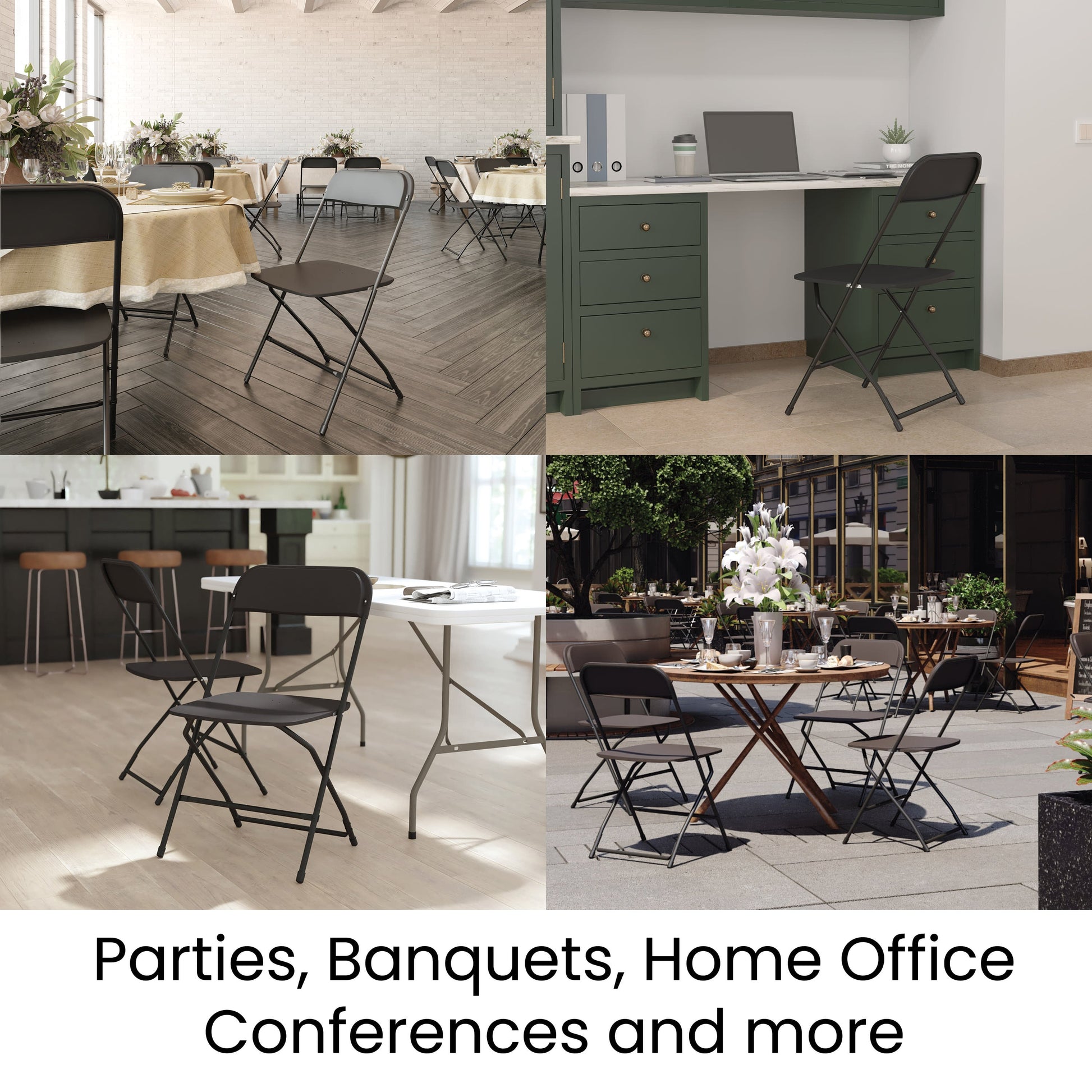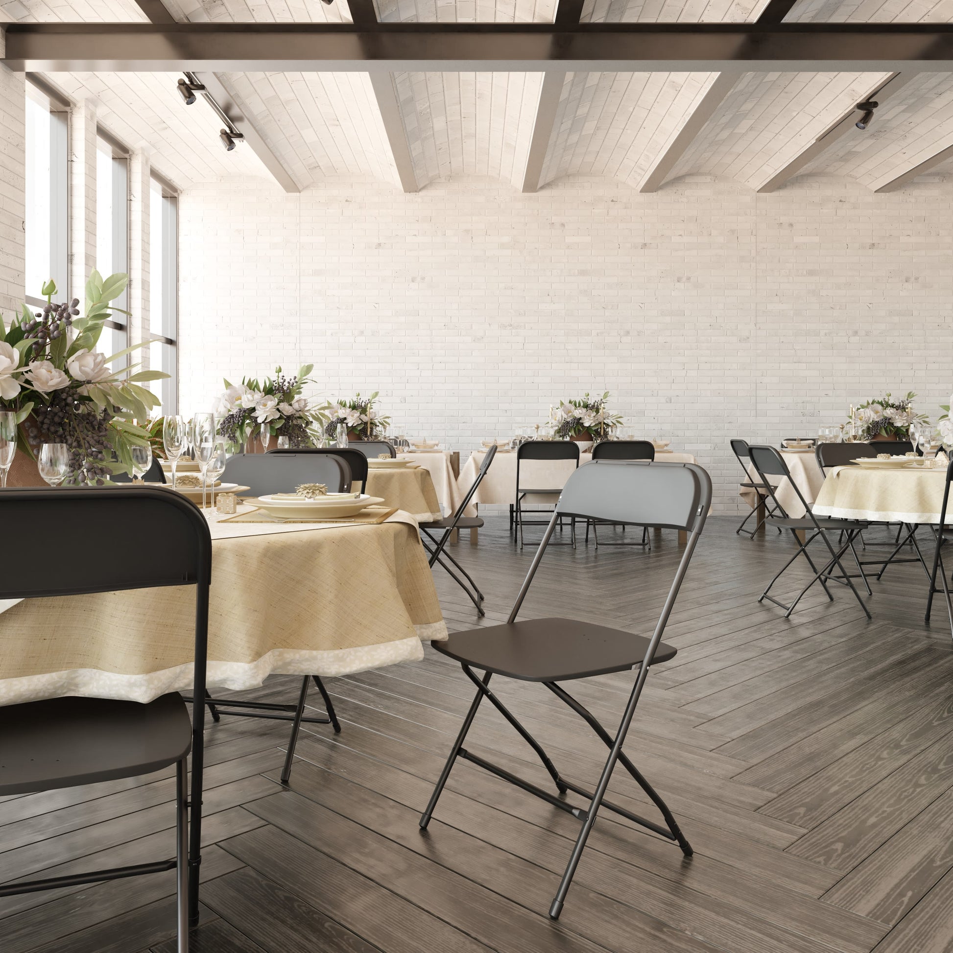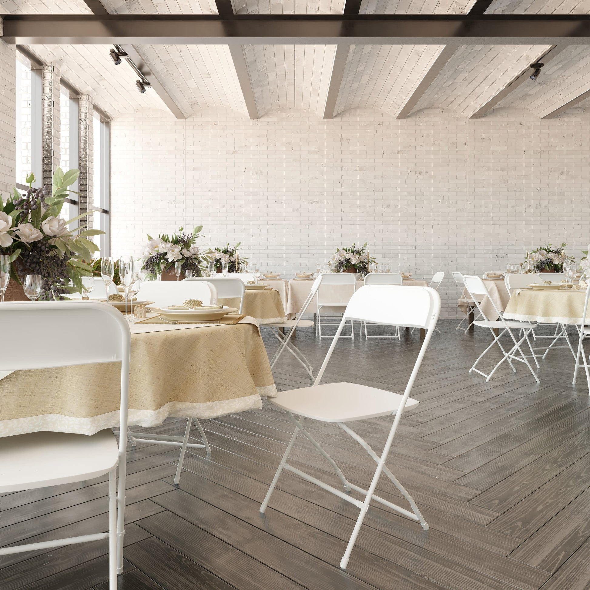Durably constructed and built to last, the reinforced steel frame along with the high impact plastic back and seat hold up to 650 lbs. static weight while non-marring floor caps protect your indoor flooring surfaces from scuffs and scrapes. The nesting design allows you to stack these party and event chairs up to 50 high from the floor or can be paired with our chair dolly for convenient storage and transport. With a variety of color options, this high capacity foldable chair is ideal for weddings, school functions, barbecues, game night, and catering events.