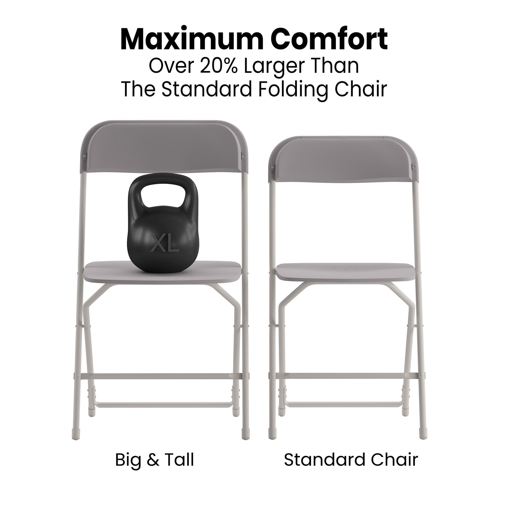 Offering contoured comfort, and innovative design, this set of 4 big & tall, extra wide commercial grade plastic folding chairs is a must have for any occasion. Adaptable to all body types, the extra width and taller height of this all-weather folding chair is ideal for those with mobility issues, or just prefer a more spacious, comfortable seating experience. Featuring dry-assist textured seats, these foldable chairs provide the highest level of comfort and security for any indoor or outdoor event.