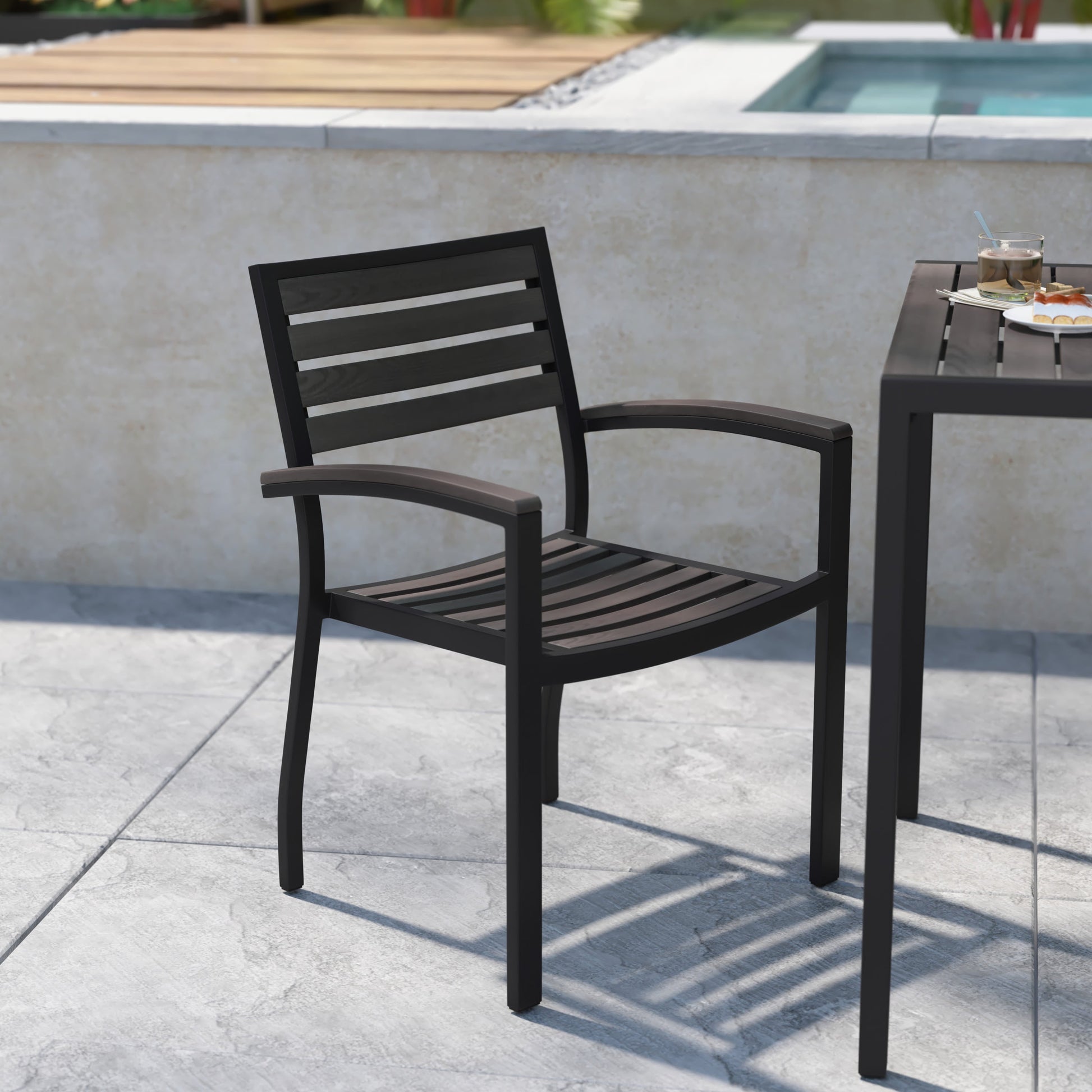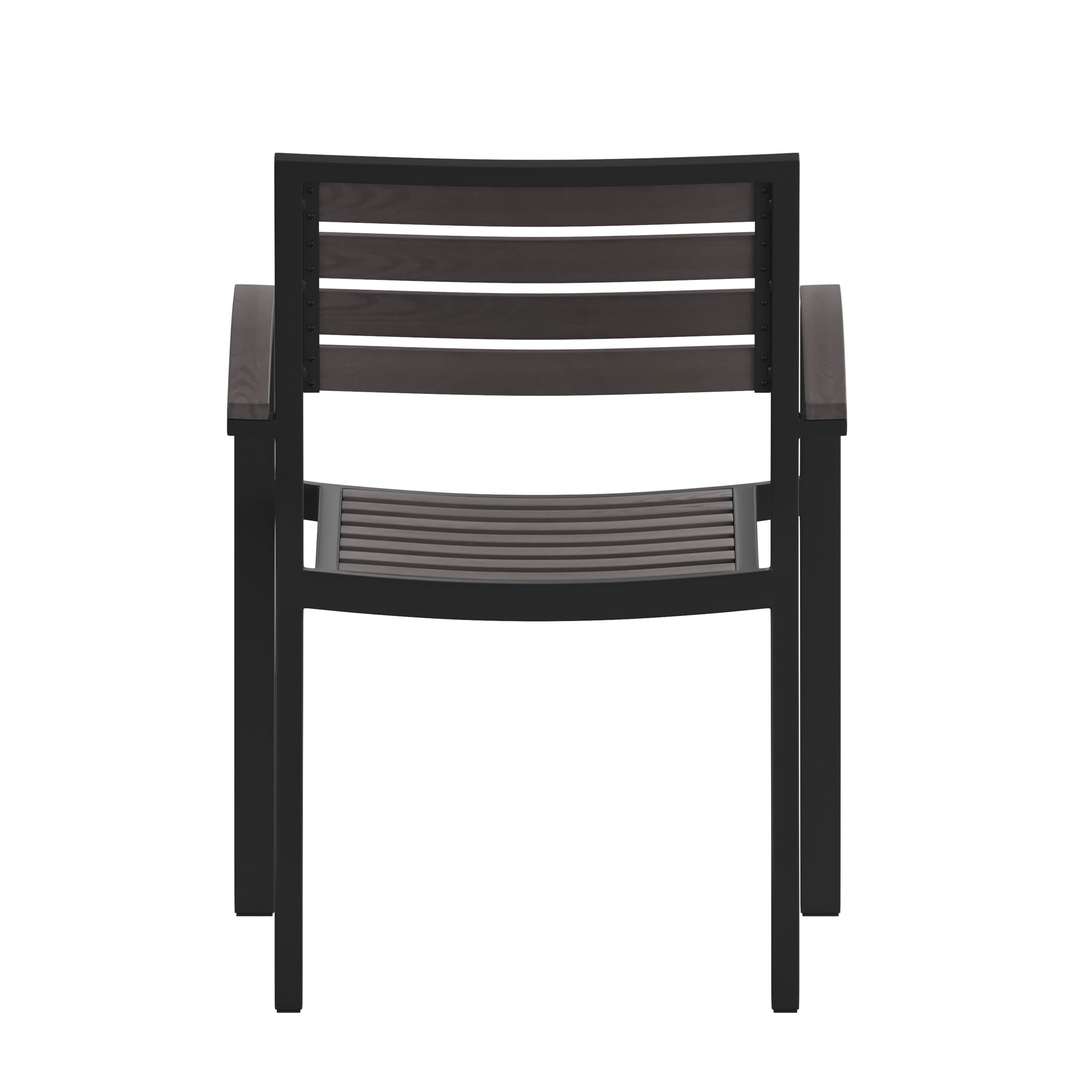 Bring the indoors outside and make the most of your patio, deck, or green space with this faux teak patio side chair. Patrons love to dine al fresco, and this all-weather dining chair won't disappoint. The trending natural colored synthetic faux teak slats on the back, seat, and arms contrast beautifully with the metal frame and blend seamlessly in almost any decor.