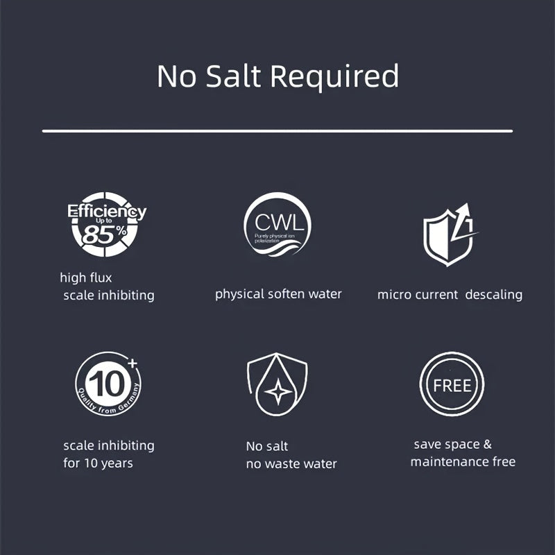 Salt-Free Operation: Achieve effective scale prevention without the need for salt, promoting healthier water usage both for consumption and household chores.