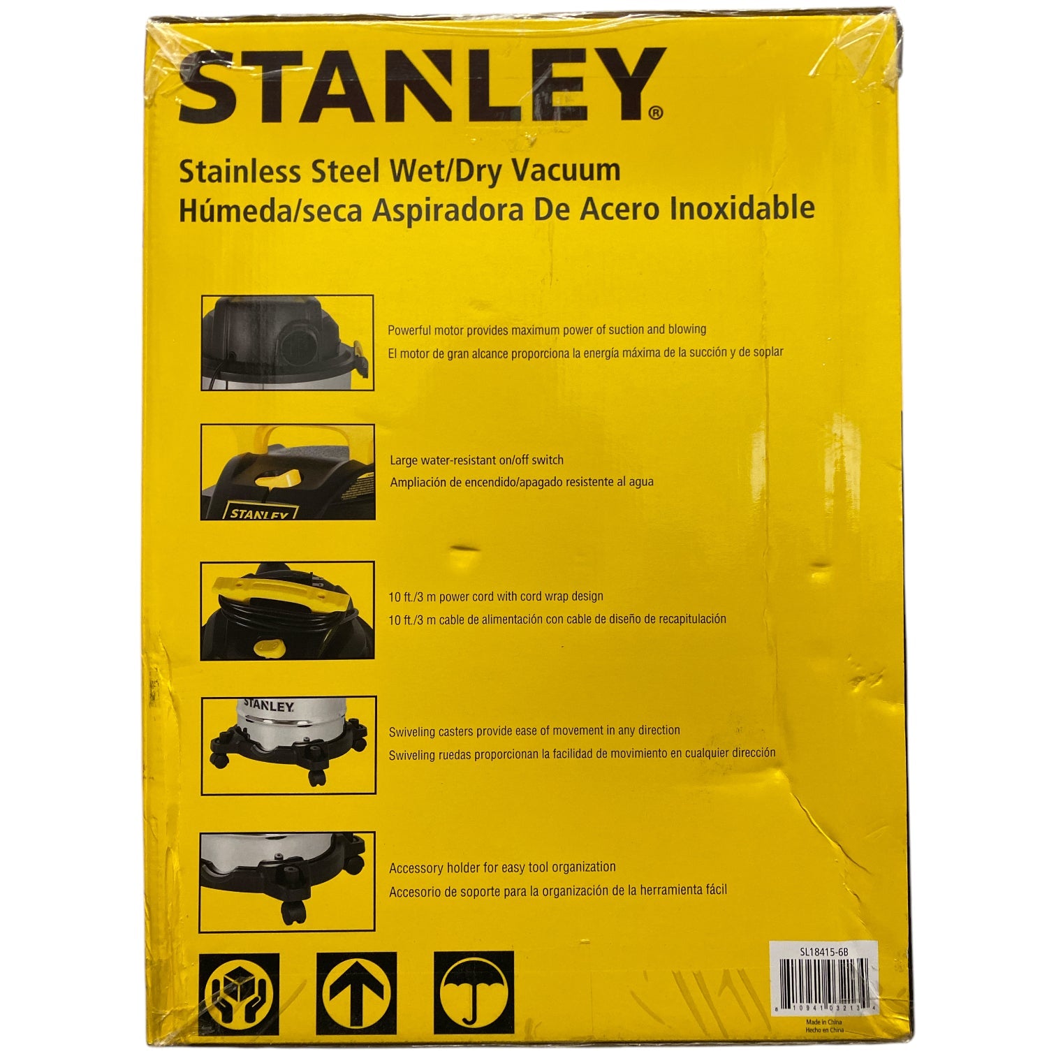 The Stanley 6 gal. 5.0-Peak HP Stainless Steel Wet Dry Vacuum is the ultimate heavy-duty cleaning machine, perfect for any cleaning job you have. Whether you're cleaning up dust in your garage or debris in your workshop, this vacuum can handle it all. With a powerful industry-leading motor, this vacuum provides maximum suction power for even the toughest jobs. The Quick-Connect port makes it easy to lock and unlock the hose, ensuring quick and convenient setup. The vacuum's versatile design allows it to handle both wet and dry pickups with ease, and the powerful blower port instantly converts it into a powerful blower. It's designed with convenience in mind, featuring a strong handle for easy carrying, a water-resistant on/off switch for safe and quick access, and a built-in power cord wrap for convenient storage. The vacuum also features accessory storage casters that keep your tools organized and provide ease of movement in any direction. The 10 ft power cord allows for a wide range of movement without having to unplug, enabling you to work hassle-free. This stainless steel wet dry vacuum is not only powerful and convenient, but it's also built to last. Its durable stainless-steel tank is designed for heavy-duty use, and the built-in tank drain makes emptying it a breeze. With its superior performance and durable construction, the Stanley 6 gal. 5.0-Peak HP Stainless Steel Wet Dry Vacuum is the perfect tool for any cleaning job. Large water resistant ON/OFF switch for safety and convenience Picks up wet and dry debris 10ft power cord with handlecord wrap design Large lid latches to secure lid to the tank Sturdy handle for easy carrying Quick-Connect locking hose system for an easy connection 3-in-1 for wet and dry pickups with blower function 5.0 heavy-duty motor providing maximum power of suction and blowing Accessories included: 6 Ft.Hose, Crevice Nozzle, 2 Extension Wands, Gulper Nozzle, Floor Nozzle, Disposable Filter Bag, Foam Filter, Cartridge Filter