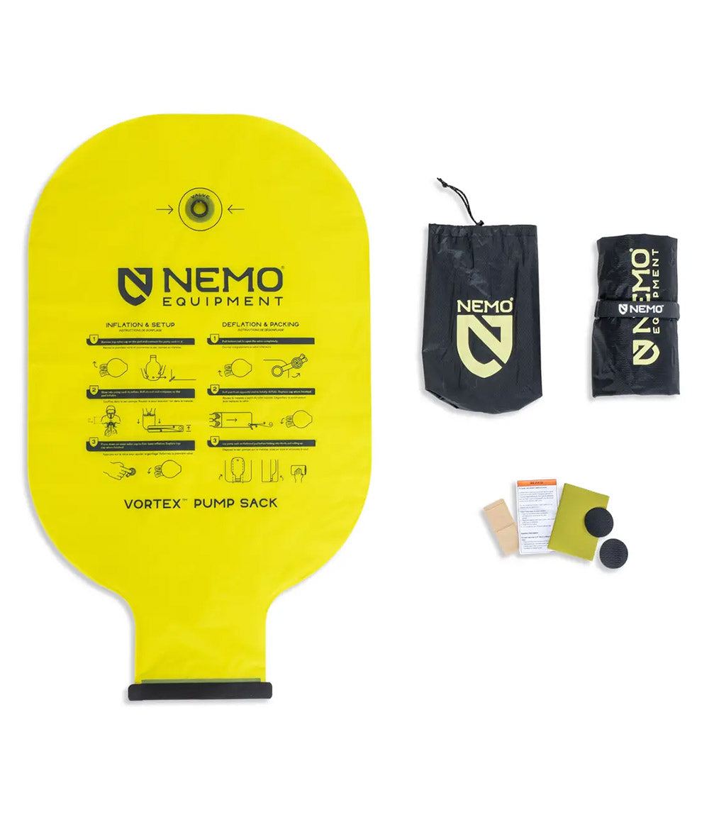 - Included Vortex™ pump sack provides easy and fast inflation, saves breath at elevation, and minimizes moisture entering the pad.