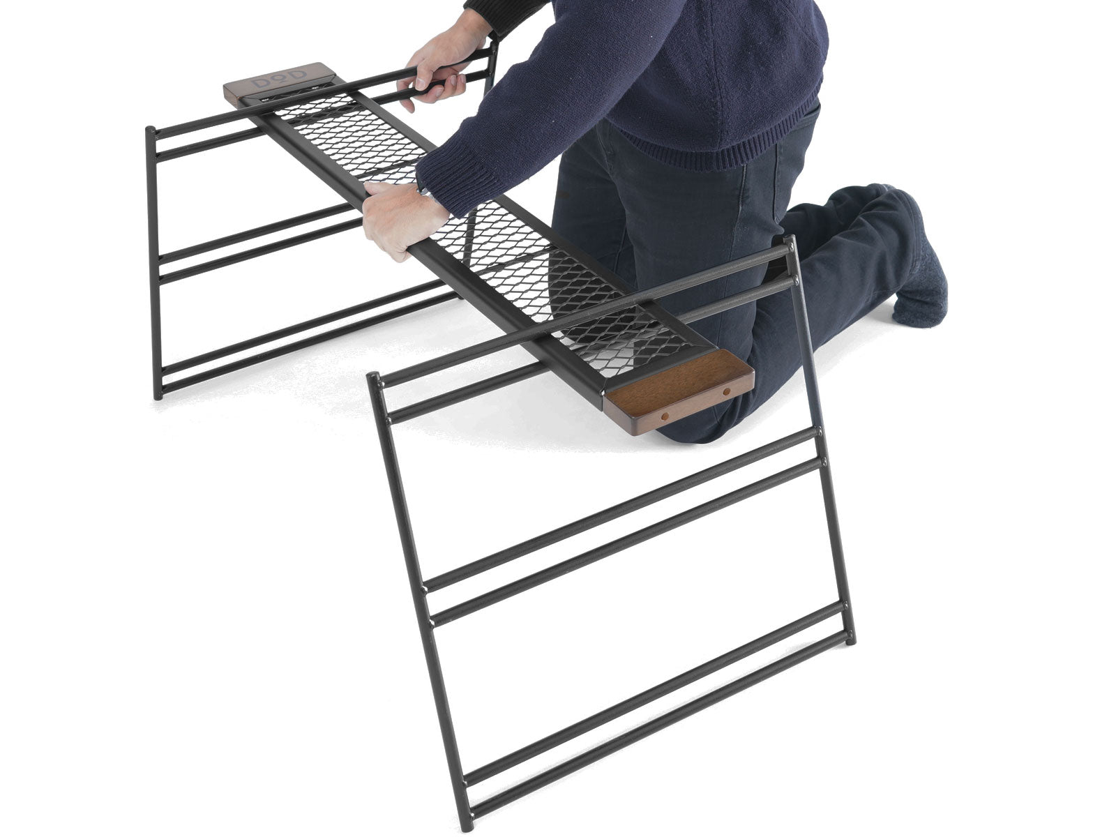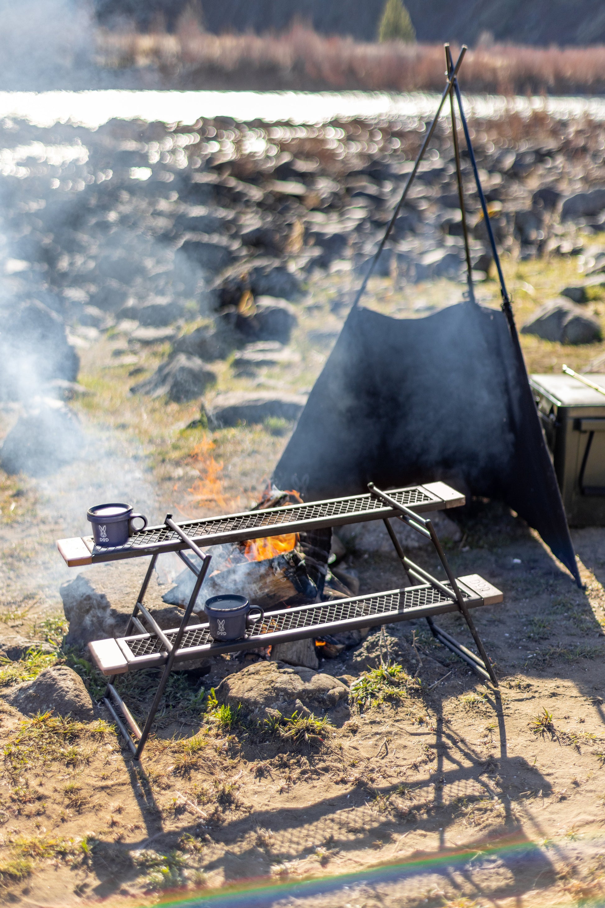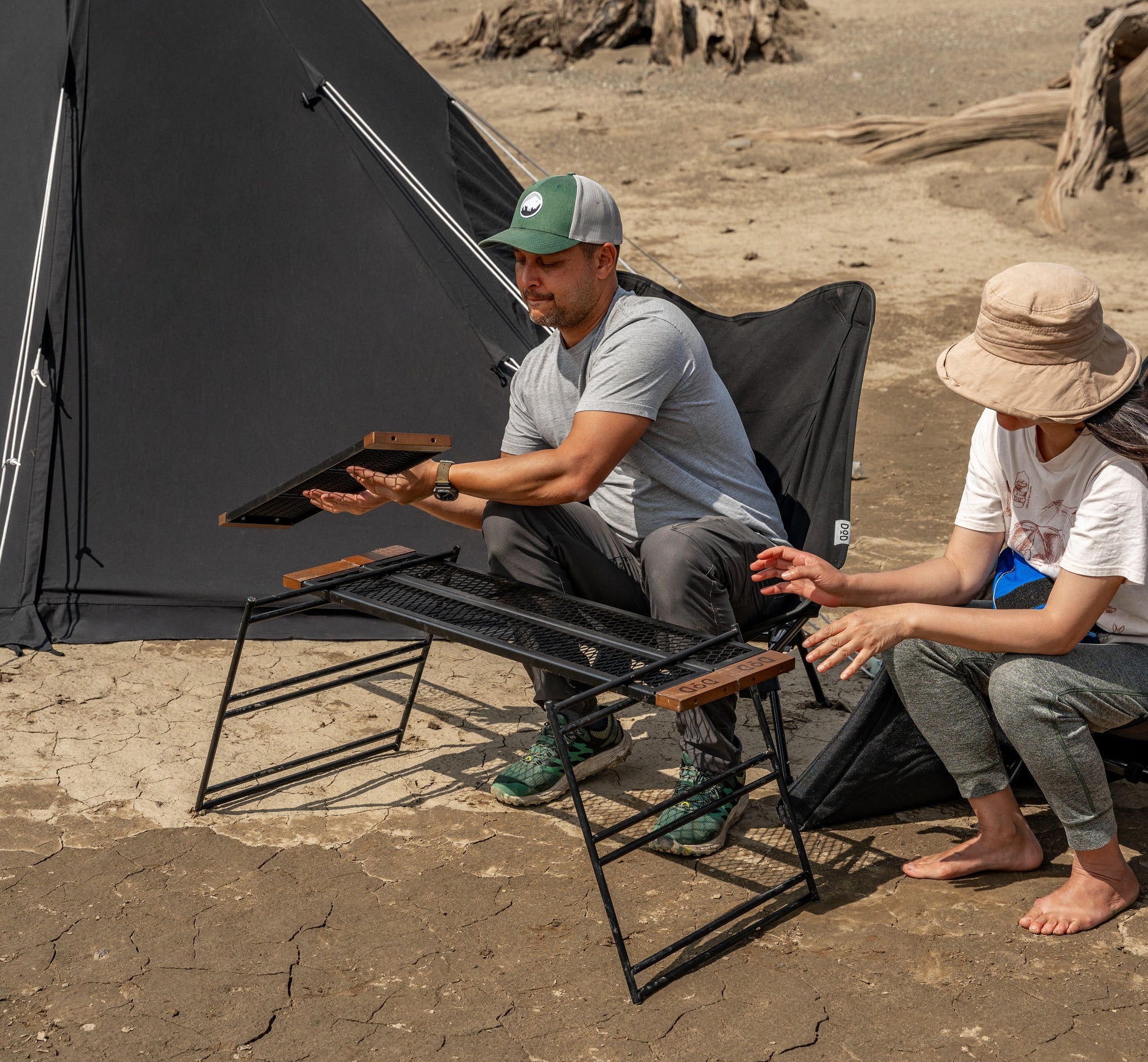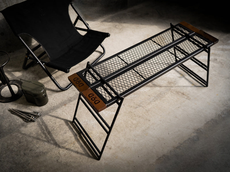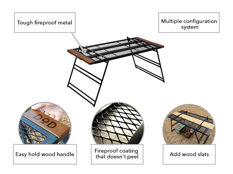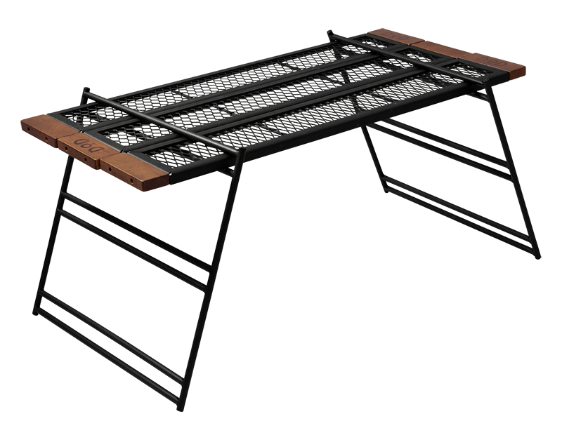 The Tequila Table, available in large (L) and medium (M) sizes, is a durable and versatile camping table. The L size includes three slats for a wider surface, while the M size comes with two. Made from tough iron, it can withstand use over a bonfire and features a special coating resistant to peeling under heat. The table's design allows for various configurations by adding extra plates and legs or using one-by-wood for customization. Its wooden edges provide a comfortable grip, updated to scratch-resistant beech wood for enhanced durability. (For a limited time, comes with custom carry bag).