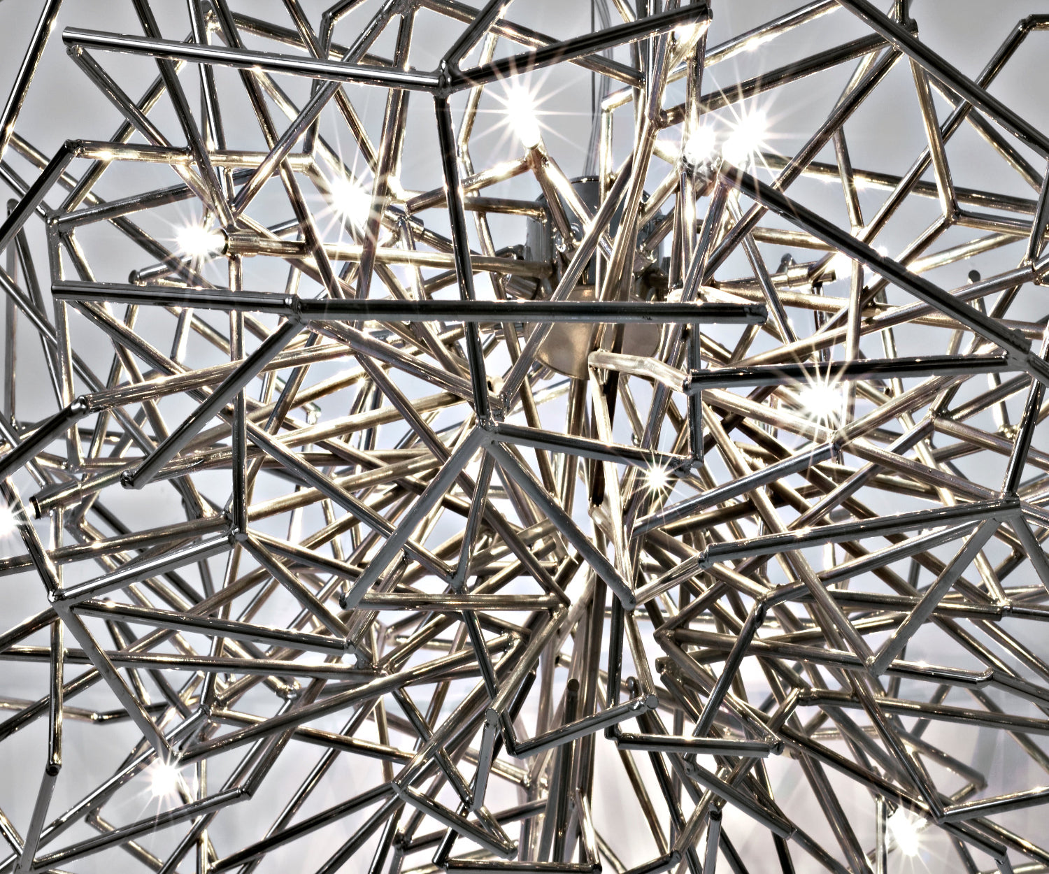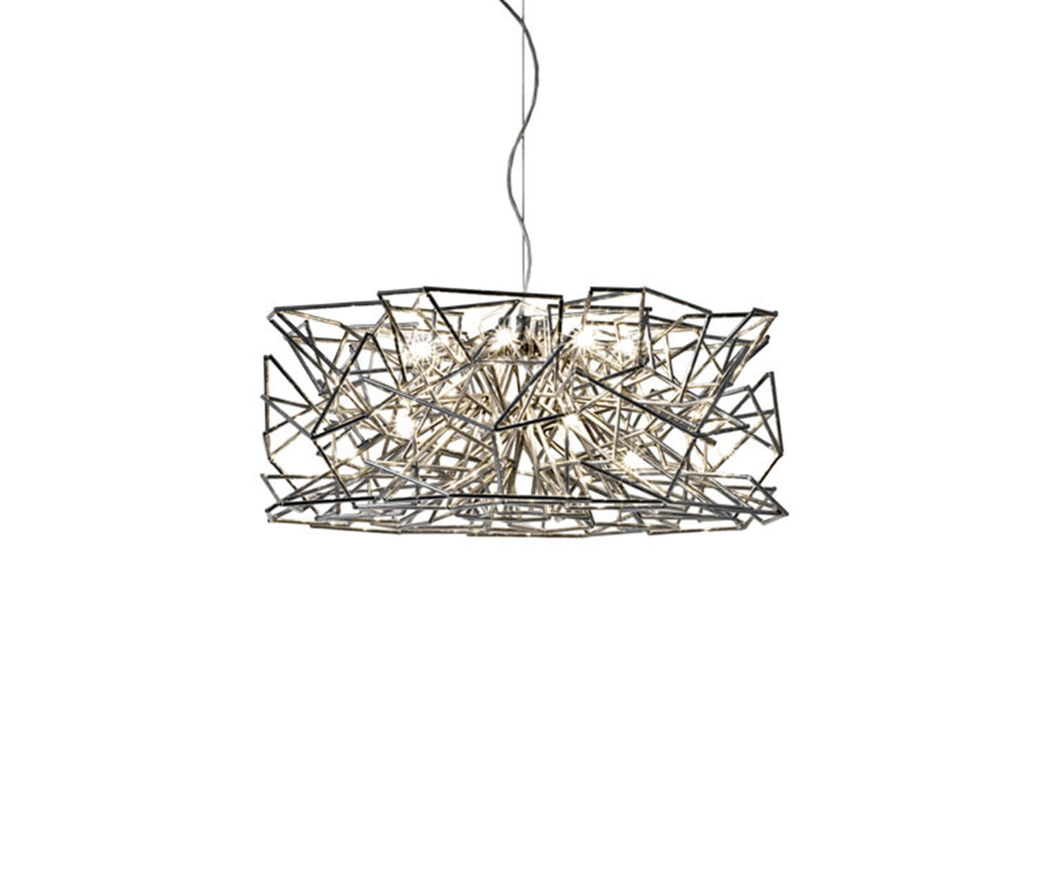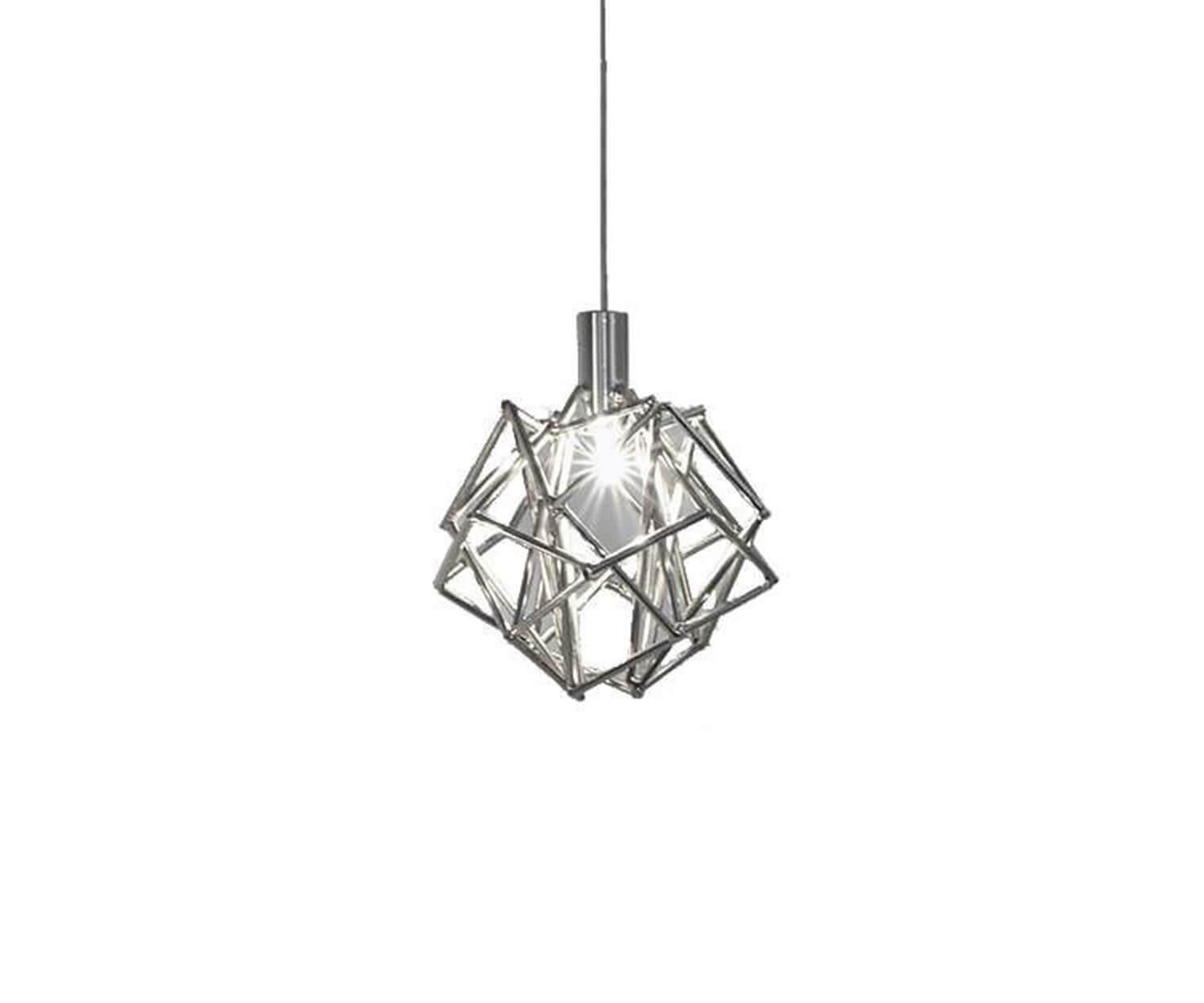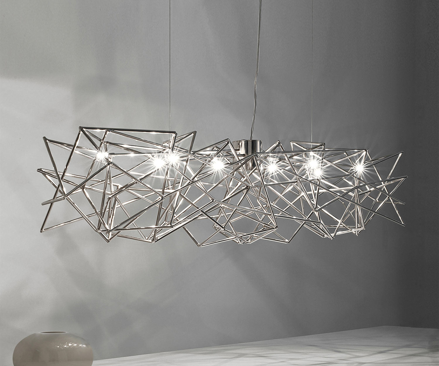The Etoile Pendant is a heavenly ambiance piece, capturing the essence of a starlit sky. The pendant's intricate network of intersecting nickel lines and strategically placed bulbs emits a starry glow, twinkling as viewers move around. The pendant transforms any room into a luminous spectacle, creating a serene atmosphere.