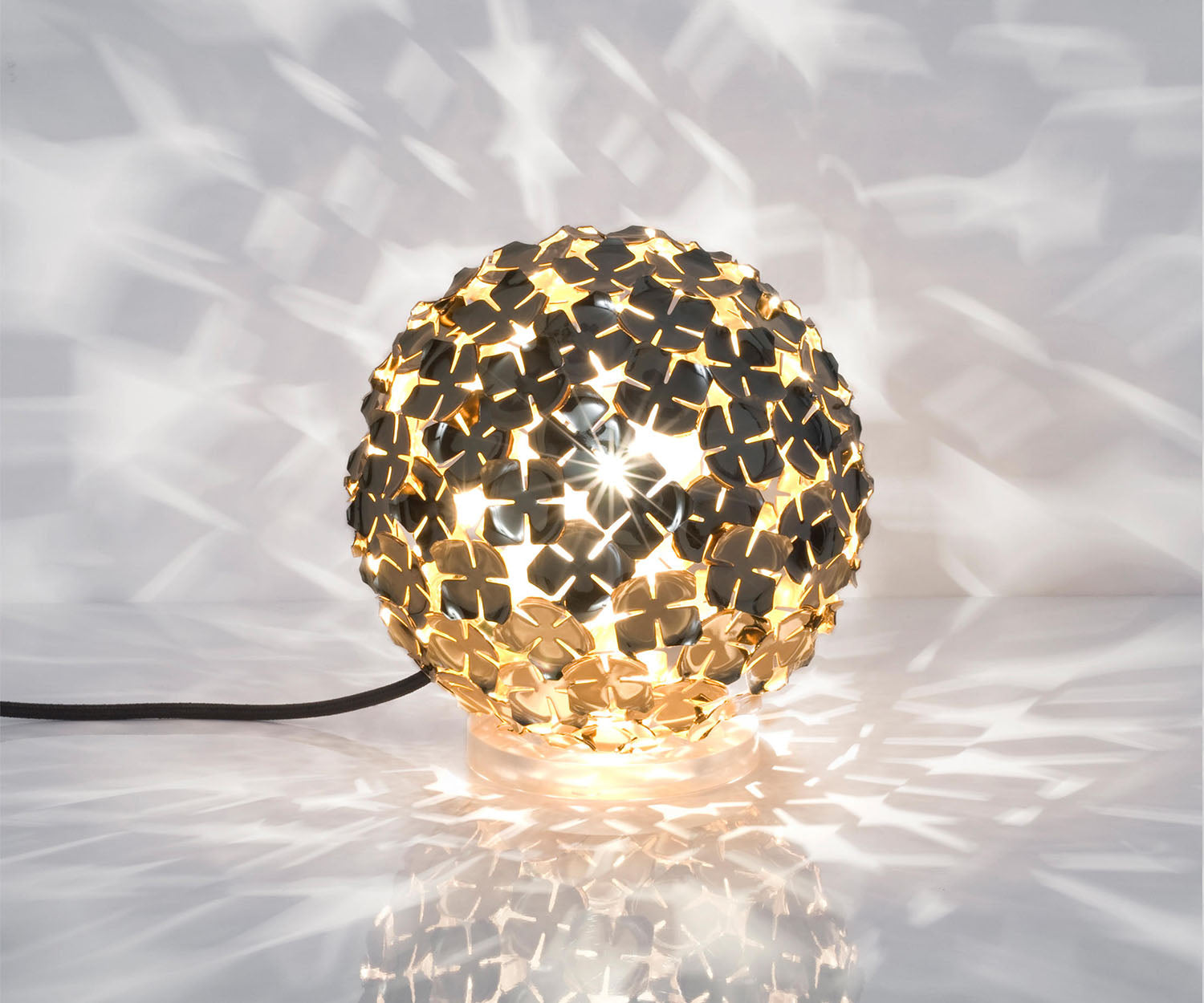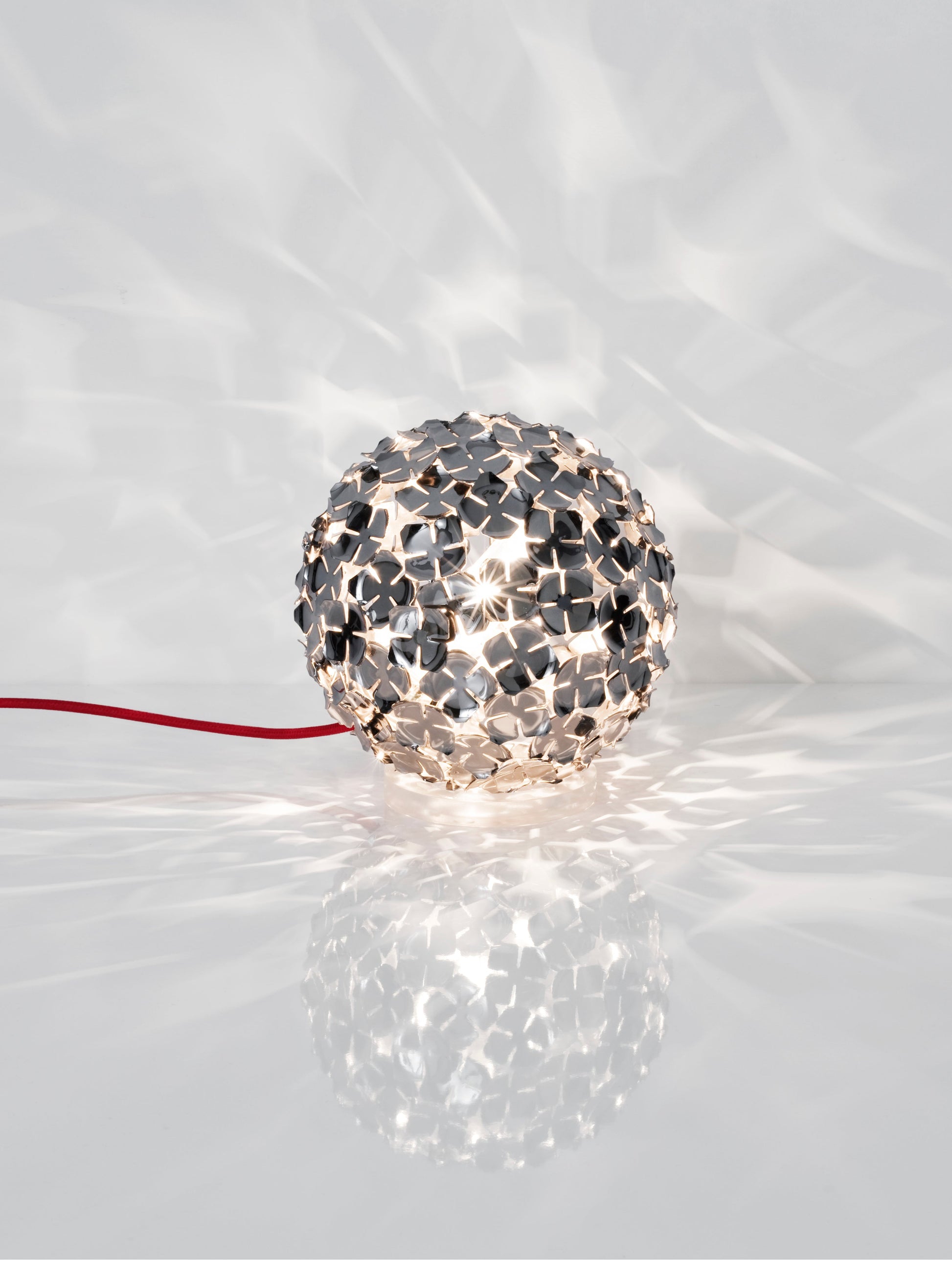 The Orten'zia Petals of Light Table and Floor Lamp is a unique piece inspired by the natural beauty of a flower that features hand-soldered petals that create a captivating glow and a garden-like ambiance. Offers in nickel or gold-plated finishes. The elegant form complements the lamp's dramatic illumination, creating a garden-like ambiance in any space.