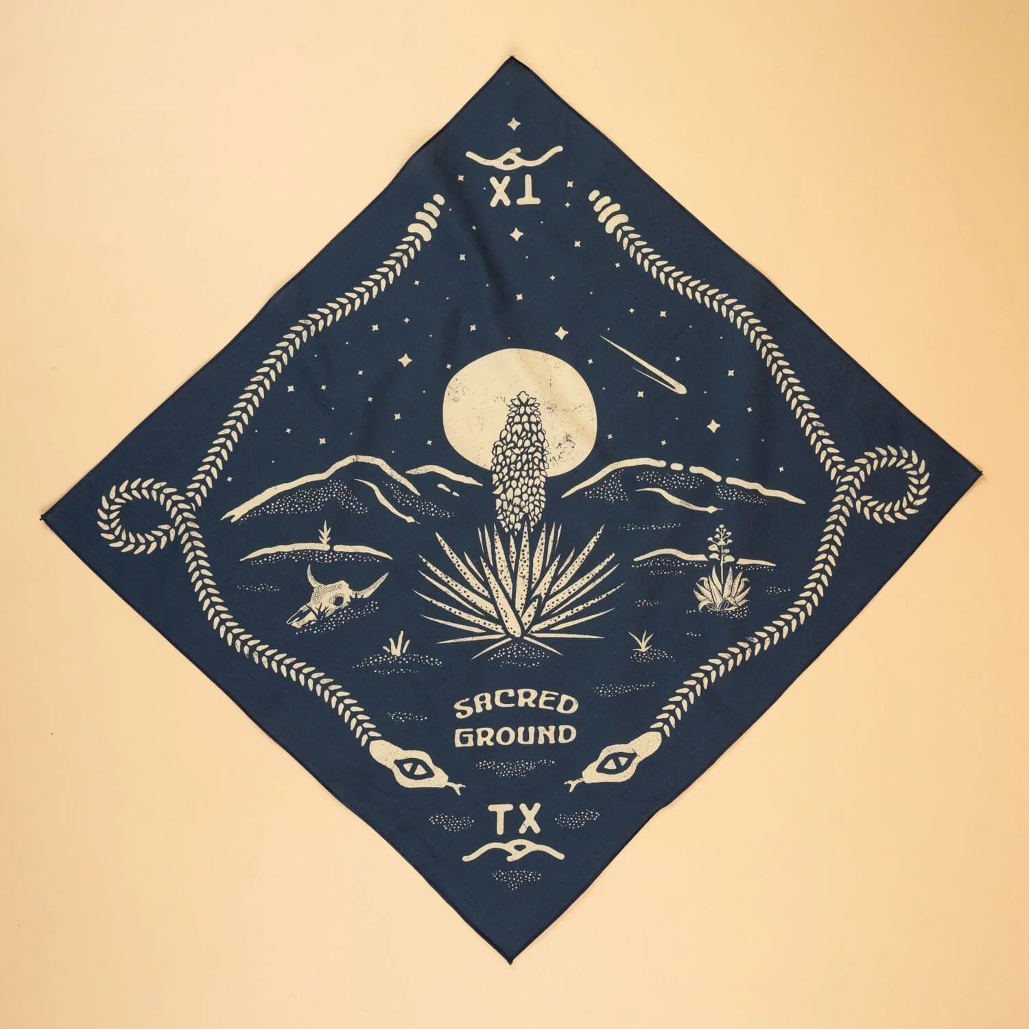 Heavyweight cotton bandanas featuring original Texas-inspired artwork and our signature 'Smuggler' stash pocket sewn on the backside.
