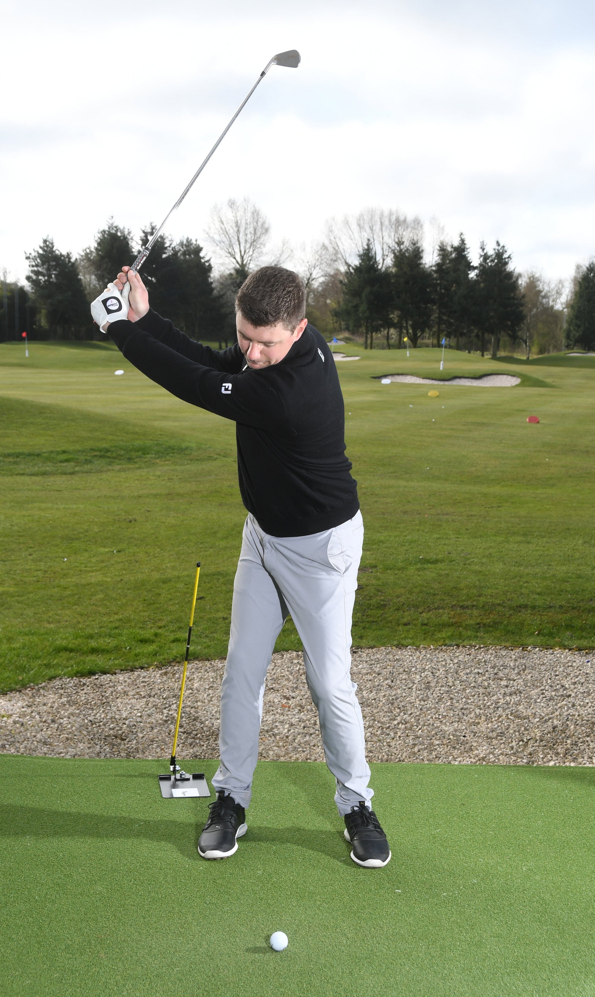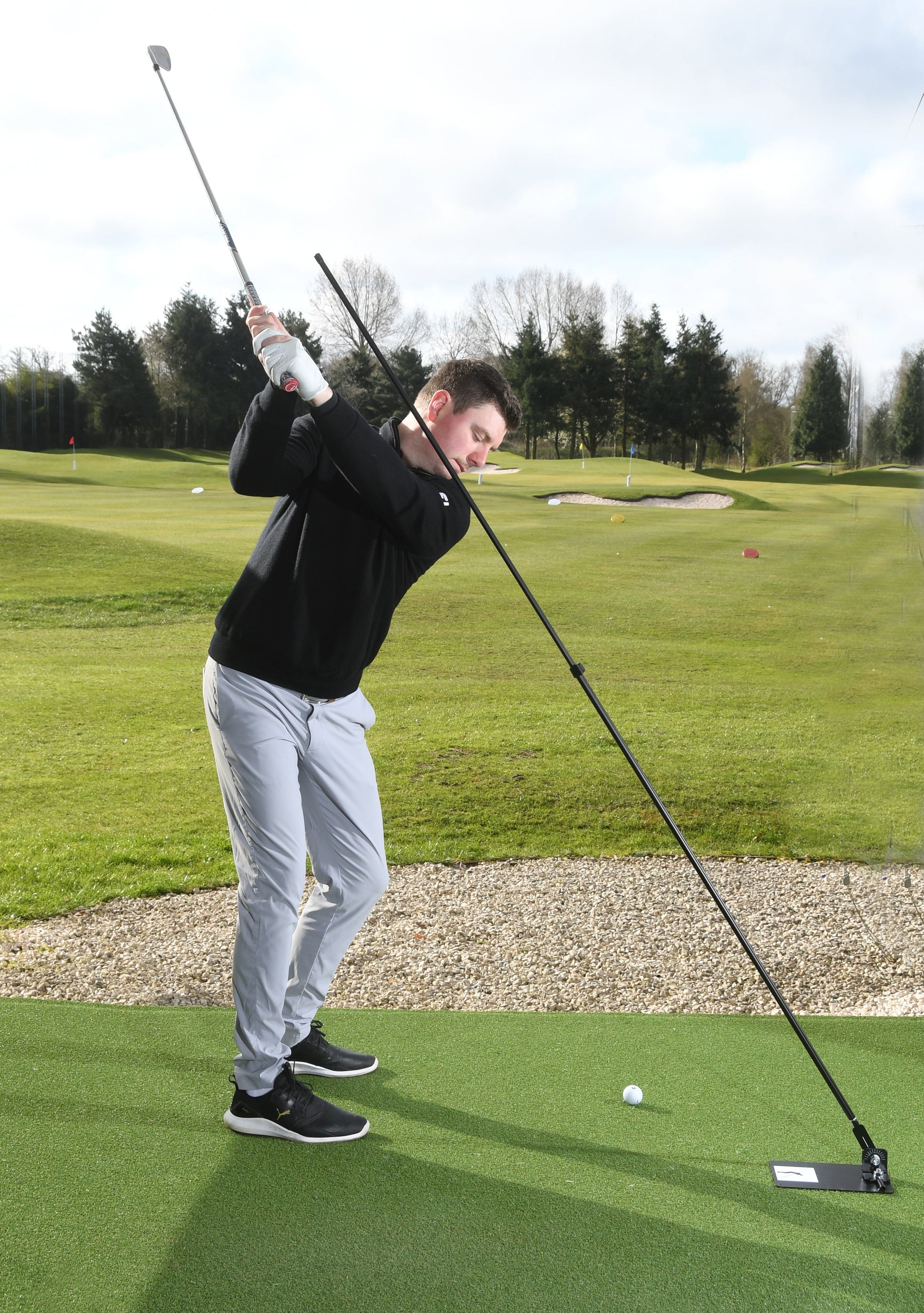 If you have a ‘flat’ backswing; to work on the functional swing plane, simply place a golf ball 1 club-head length away from the alignment stick that’s on the floor & adjust your other alignment stick so it is matching your shaft address position with the club you are using.