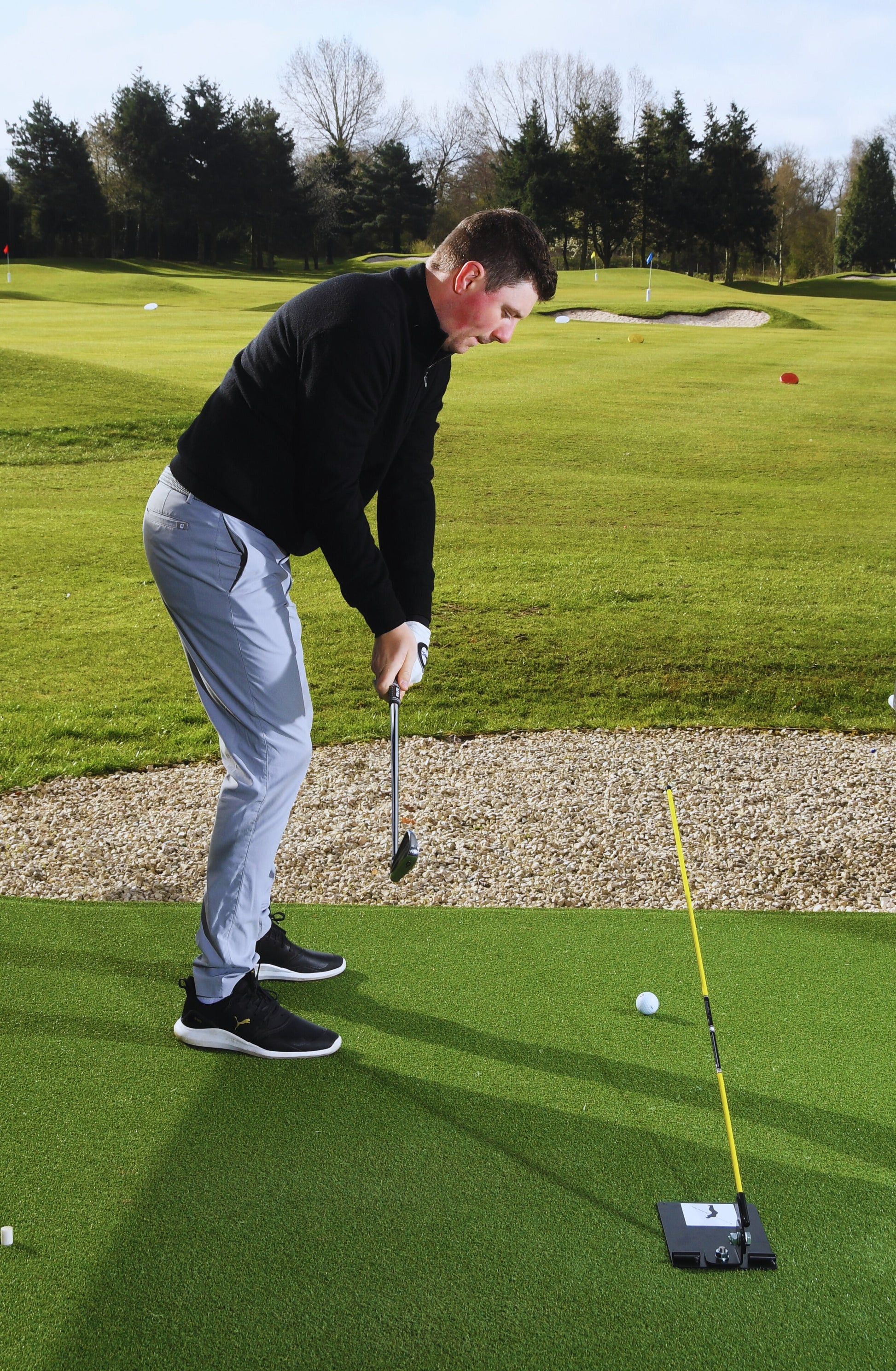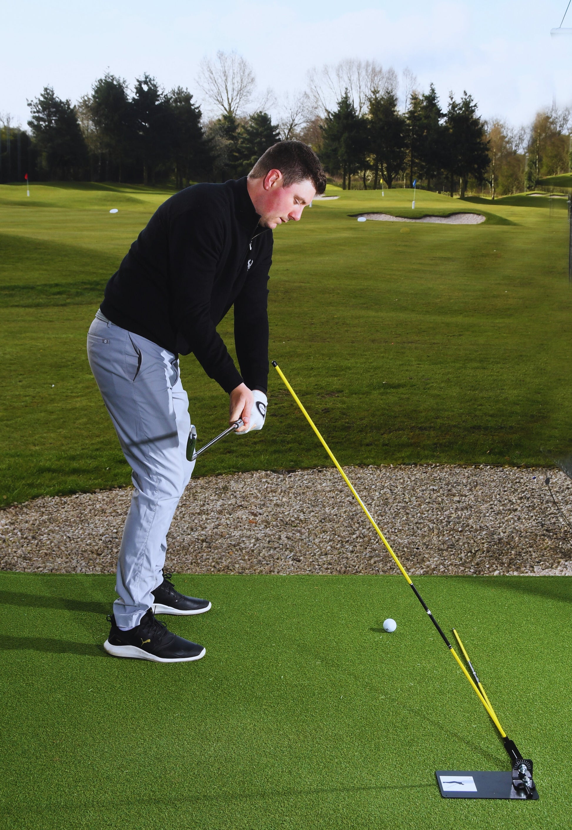Place The Swing Plate behind you and angle it so your alignment stick is about 3 inches to the target side of your target leg. Your goal on the downswing is to nudge it.