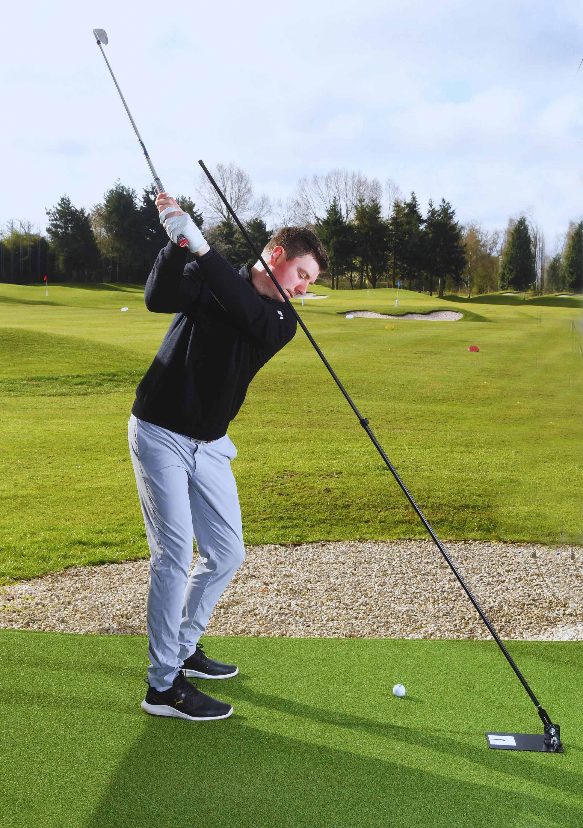 Place your Swing Plate behind you and angle your alignment stick next to your trail leg or hip. Your goal should be to make a backswing without touching the stick.