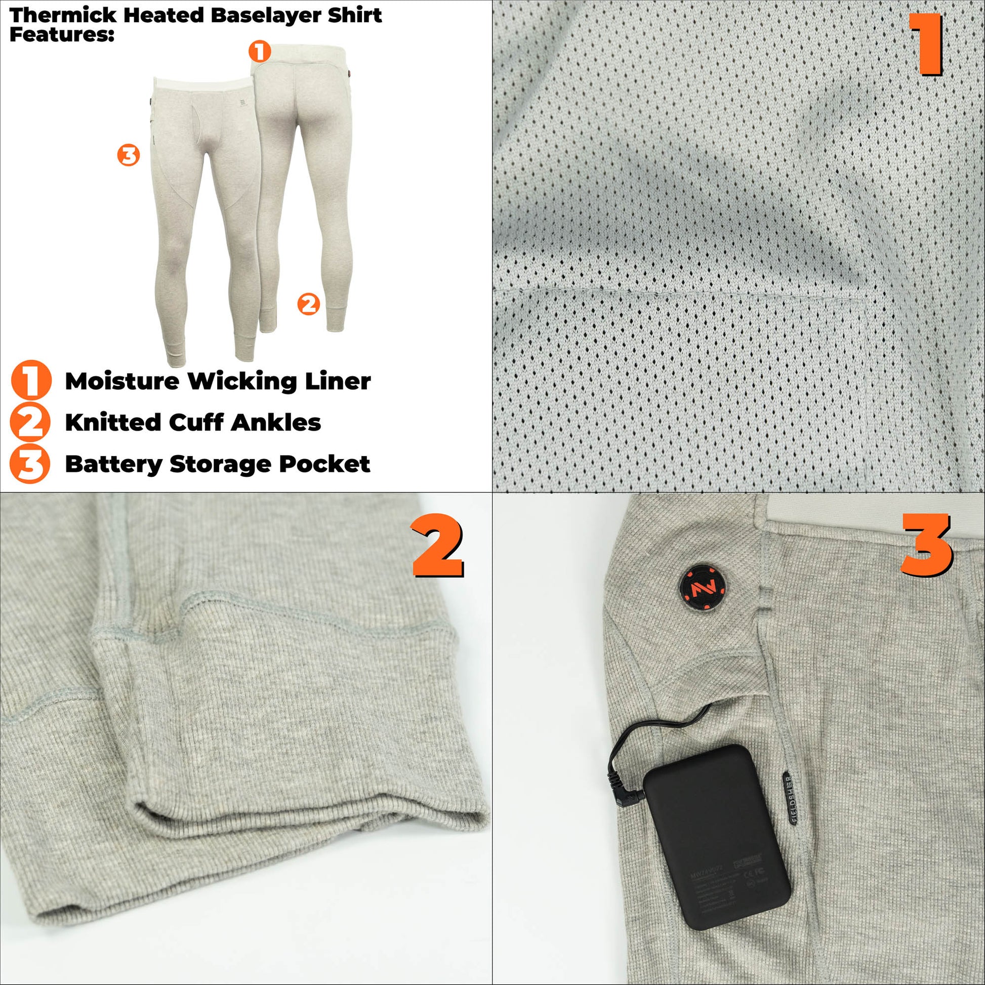 The Thermick Heated Baselayer Pants allow you to keep going no matter what the conditions throw at you, and by maintaining a healthy temperature, you reduce fatigue, muscle soreness and decrease sensitivity. Fieldsheer continues to deliver unparalleled performance and rugged durability without sacrificing comfort, mobility, or value. Since 1978 Fieldsheer has been a leading manufacturer of outdoor apparel, men’s heated clothing, and women’s heated clothing. We know that conditions can change rapidly, and our Thermick Heated Baselayer Pants let you adapt and stay warm in any environment, from arid desert conditions to high Alpine timberlines. Men’s Thermick Heated Baselayer Pants come in grey, and women’s are made in a stylish tan.