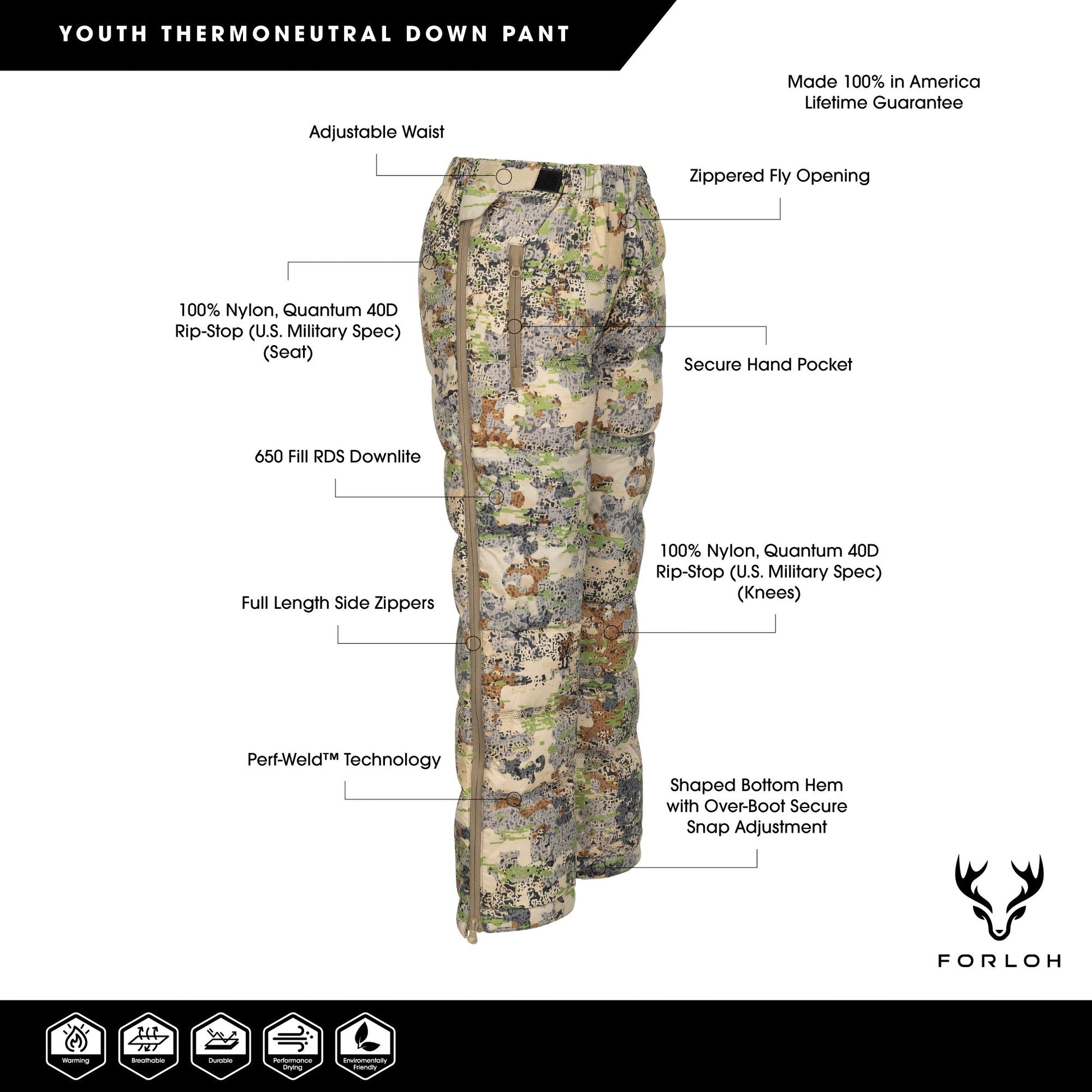 Featuring FORLOH’s exclusive Perf-Weld™ technology, a first in youth down hunting pants. This allows condensed and non-condensed moisture to escape through micro-perforations in the waterproof sonic welds, keeping kids dry from sweat and regulating their core temperature during periods of rest and vigorous activity alike.
