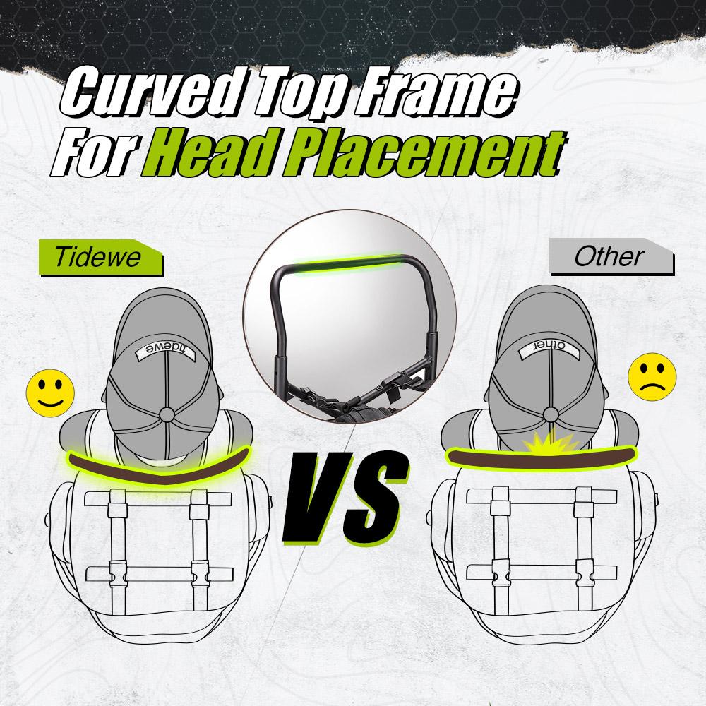 - Ergonomic Design & Comfortable-TideWe Large pack is designed with adjustable shoulder straps and frame, customizing your personal size. The ergonomic design with soft and breathable padding offers pressure reduction makes long walks much easier and comfortable on your body. Curved top frame design is suitable for your head placement, protecting your head from being hit. The lightweight and compact frame, along with the folding freighter shelf, is perfect for your hunting trip.
